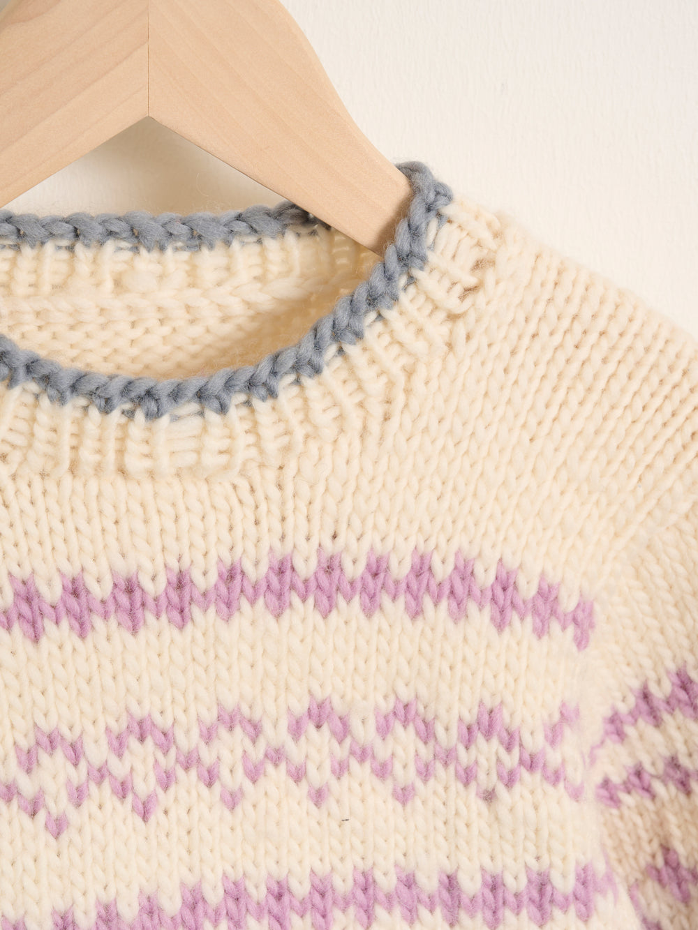 Lucca Sweater Junior er en moderne fortolkning af den klassiske færøske sweater. Sweateren er helt enkel med sit minimalistiske mønster i to farver, men har fået et twist med en smal stribe i en tredje farve i sweaterens ribkanter.