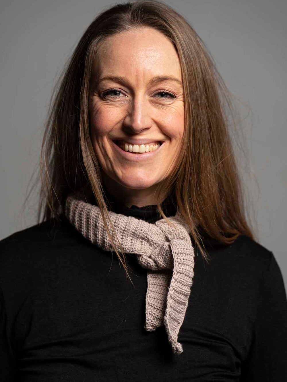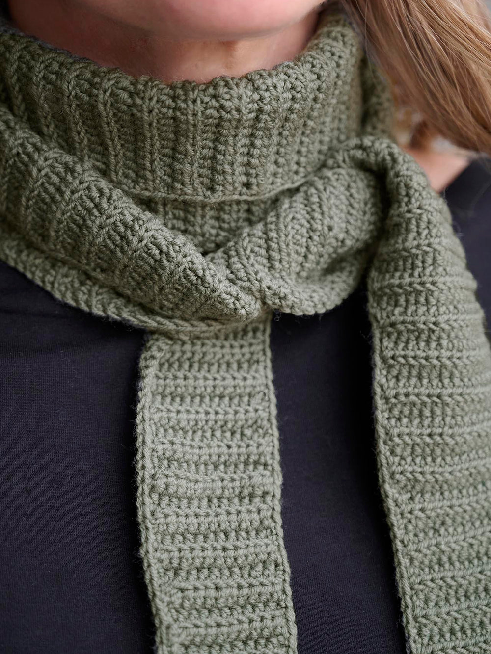 Det lange, smalle tørklæde er dejligt at have på. Det hækles i lun uld, og du kan derfor sagtens bruge det udenfor. Da det ikke fylder meget om halsen, kan du også bruge det inden døre.