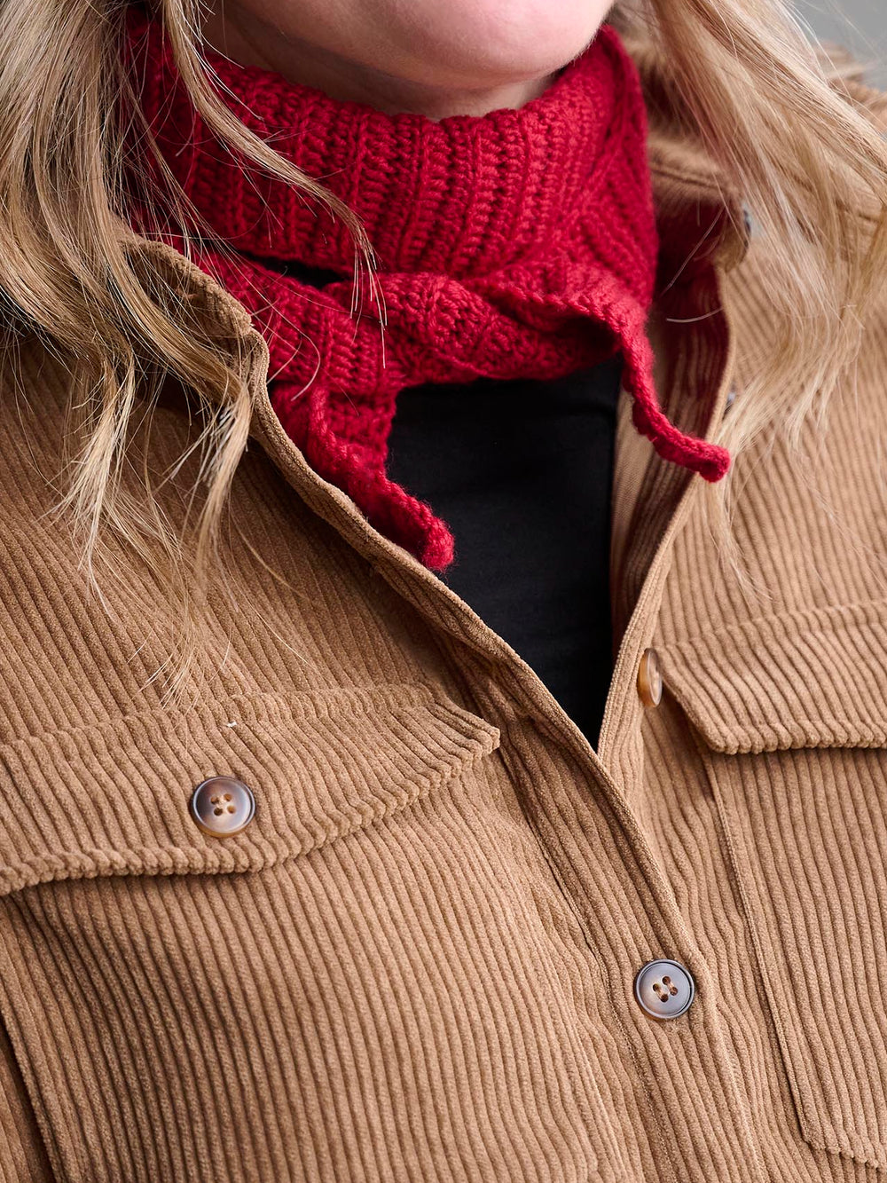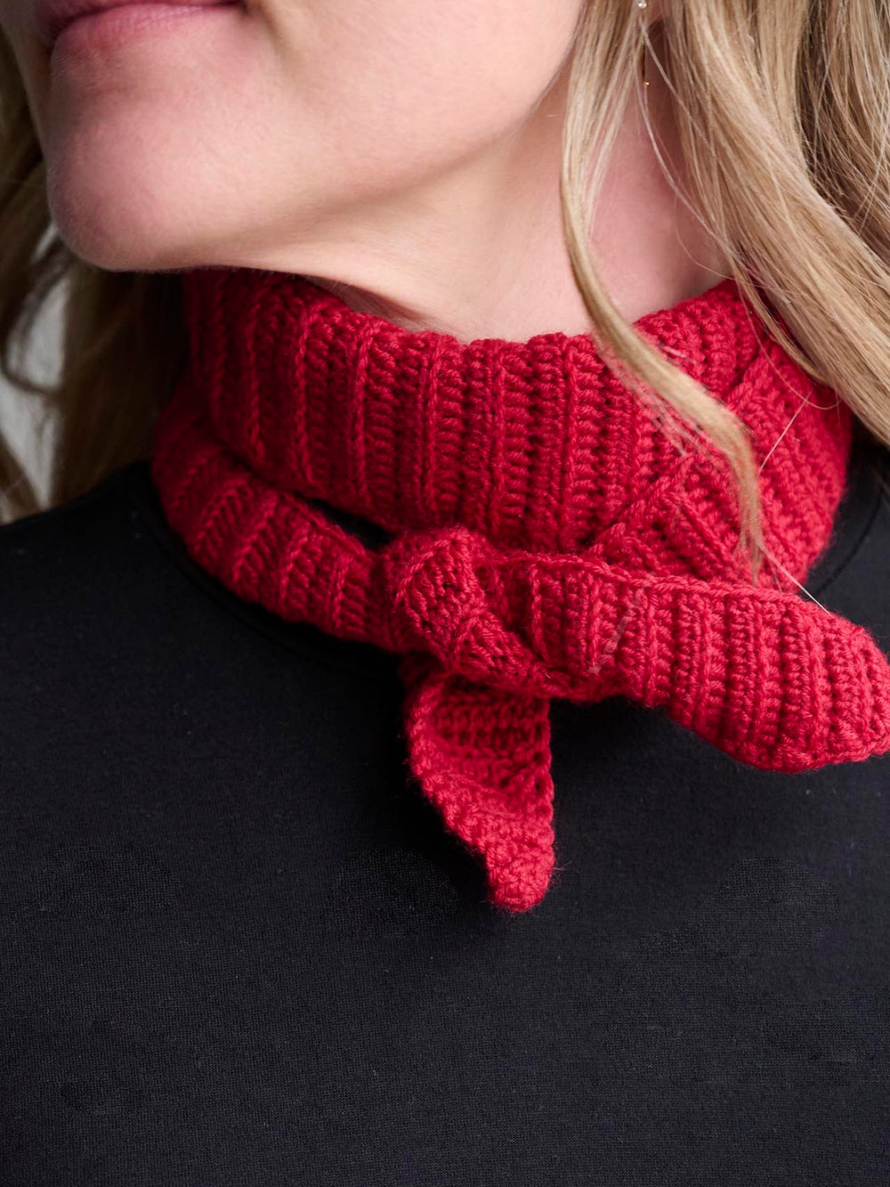Tørklædet hækles i ribmønster ved at hækle halvstangmasker i det bagerste maskeled. Opskriften indeholder to forskellige størrelser af tørklædet, hvor du selv kan vælge, hvor langt dit tørklæde skal være.