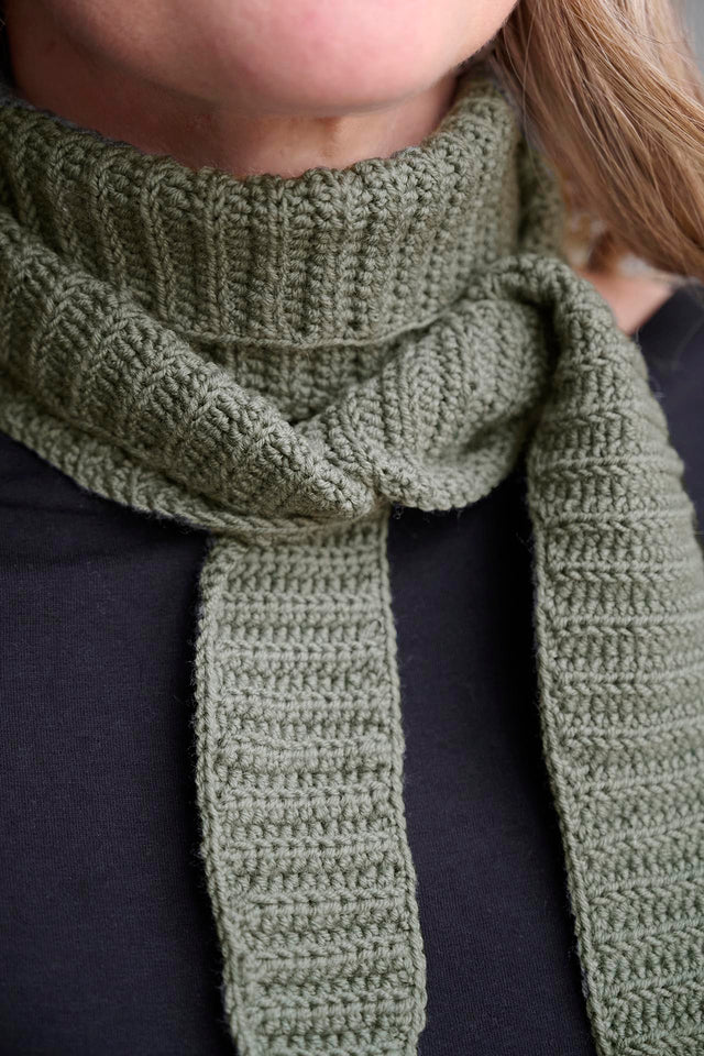 Det lange, smalle tørklæde er dejligt at have på. Det hækles i lun uld, og du kan derfor sagtens bruge det udenfor. Da det ikke fylder meget om halsen, kan du også bruge det inden døre.