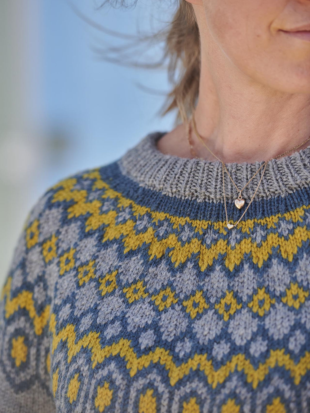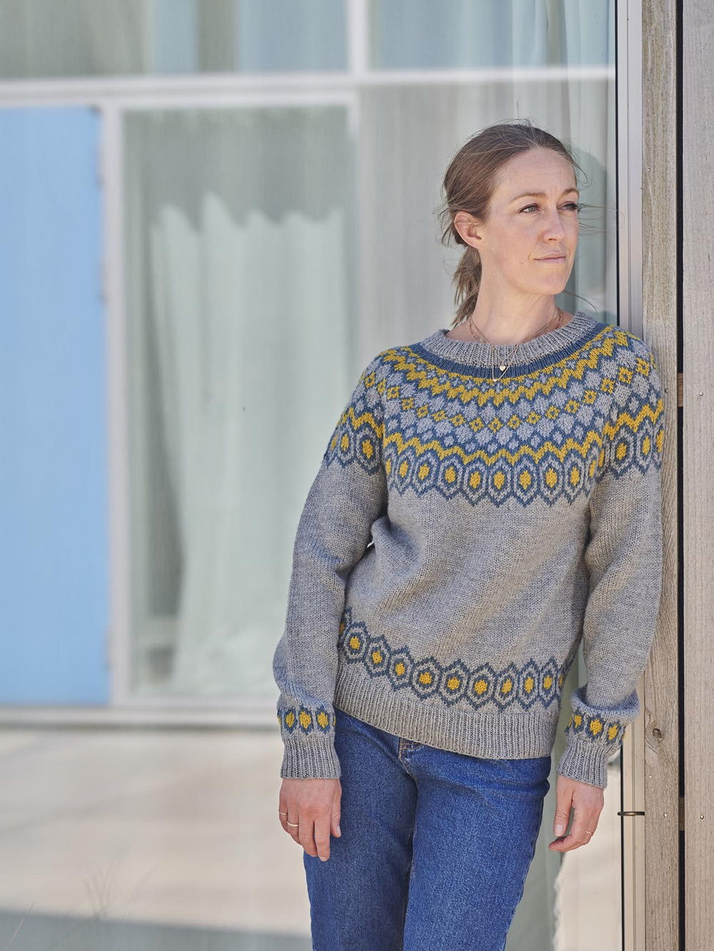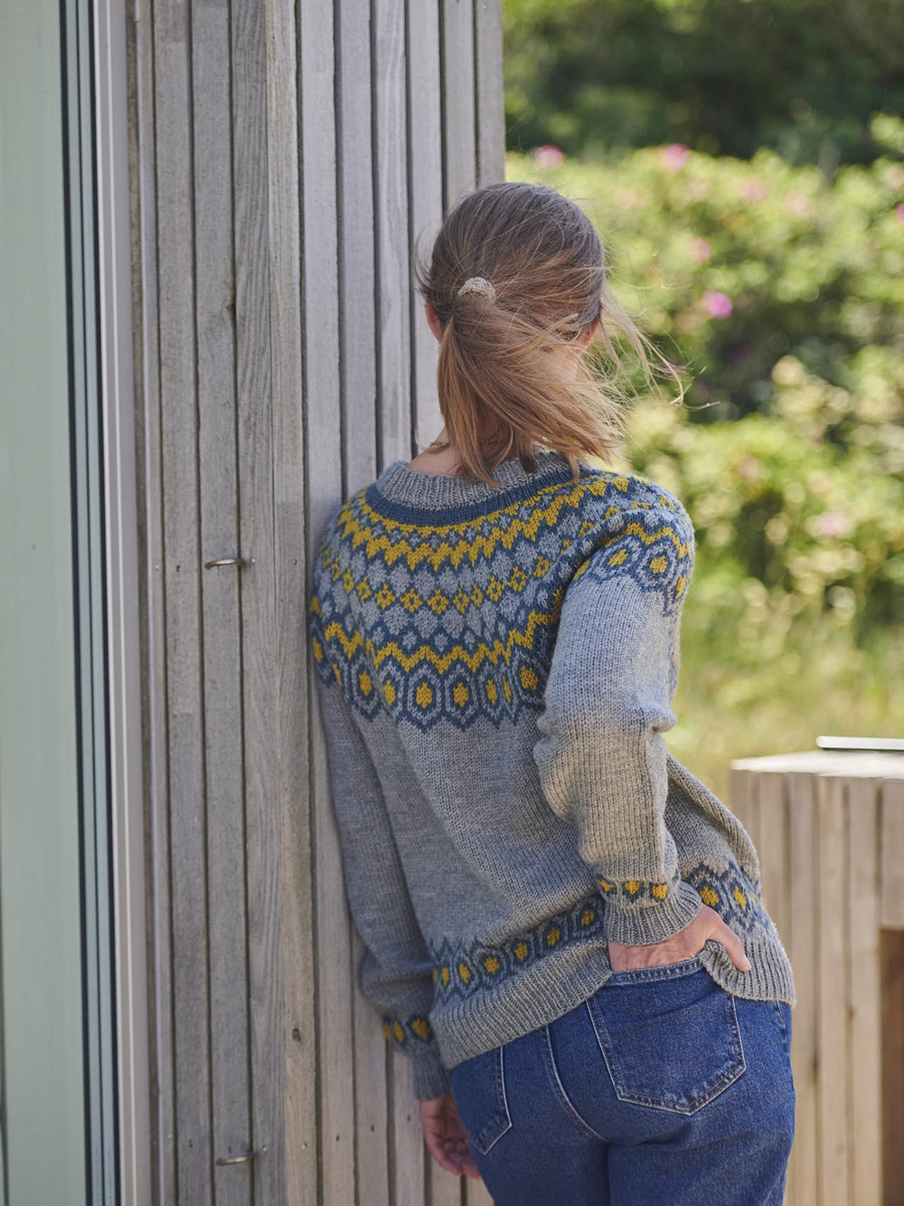 Lydia sweateren strikkes nedefra og op i glatstrik og med kanter i rib.