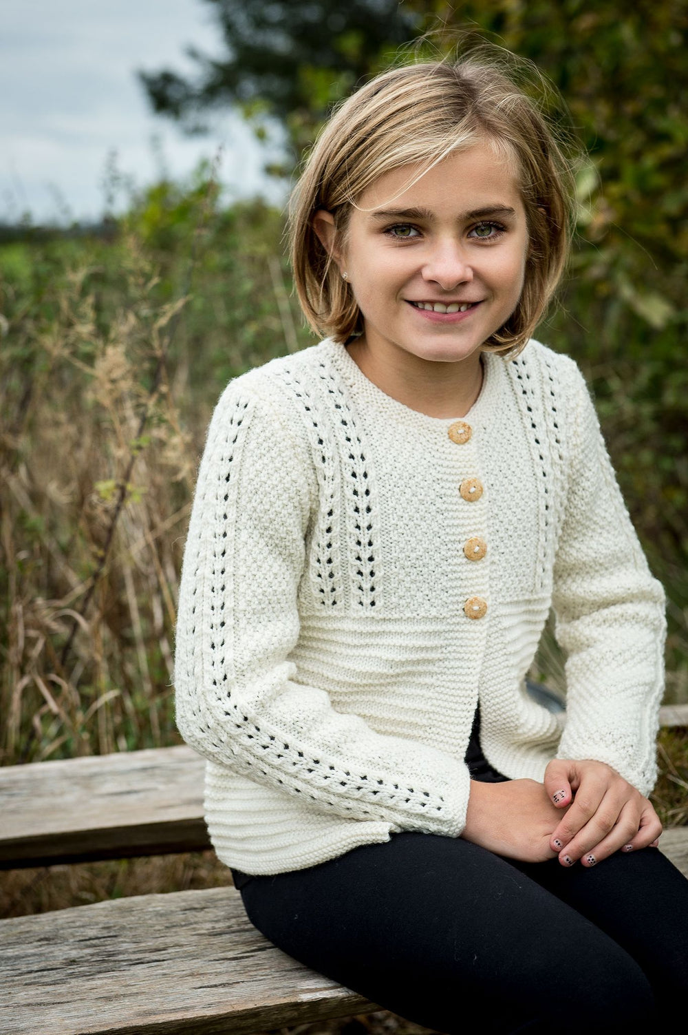 Denne fine pigecardigan er især kendetegnet ved sit enkle men smukke hulmønster, der står i kontrast til den klassiske perlestrik og et retrillemønster, som skaber fin struktur. Foran har cardiganen fine træknapper, så den kan lukkes. Ærmerne er efterfølgende påsyet.