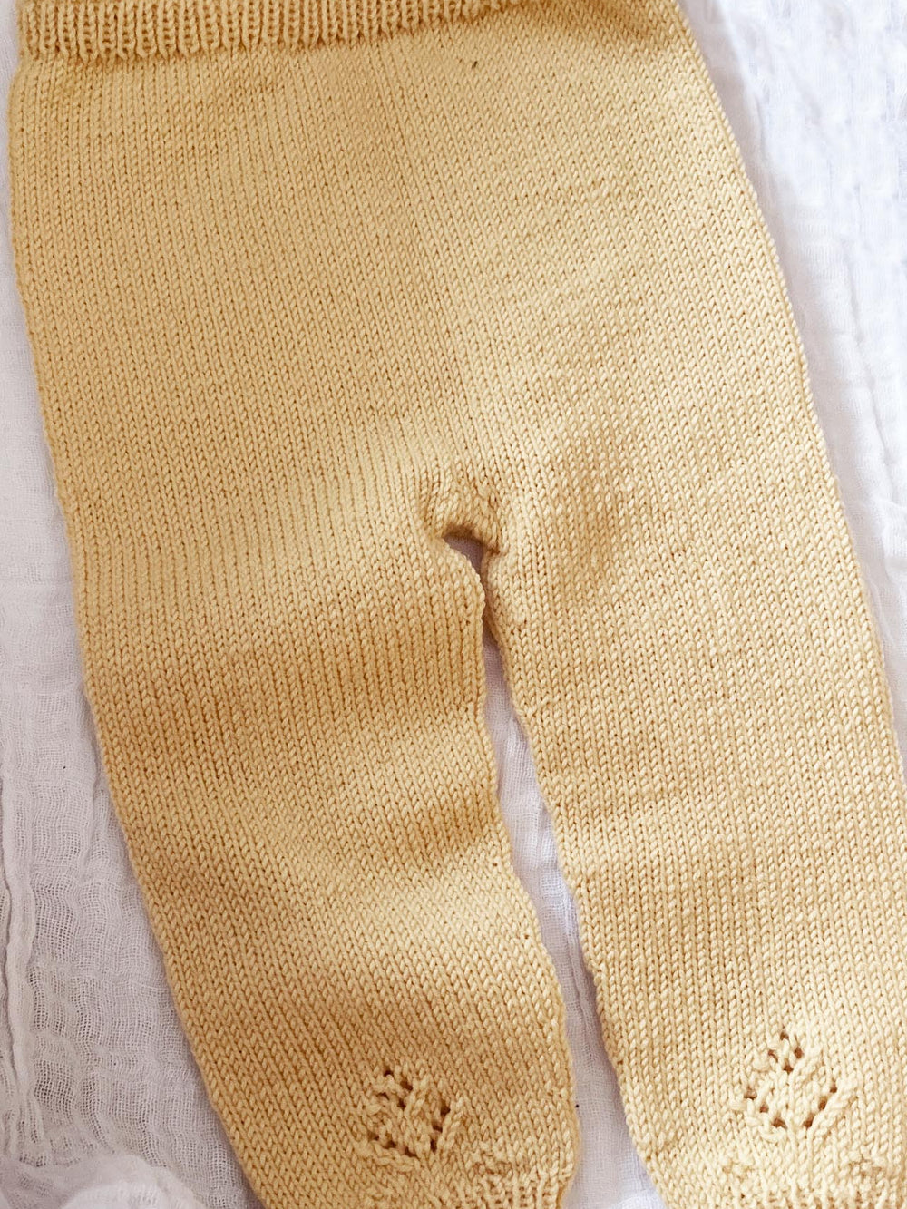 De bløde Mælkebøtte Bukser strikkes oppe fra og ned i glat. Nederst ved anklerne er der en lille ribkant, som sørger for, at bukserne ikke så nemt glider op ad benet på den lille. Over ribben er der på begge ben lavet et bladmønster som en lille fin detalje. Bagsiden af bukserne strikkes lidt højere med vendepinde for at give dem en bedre pasform. I livet er der monteret en elastik under den ombukkede ribkant, som sikrer, at bukserne bliver siddende.