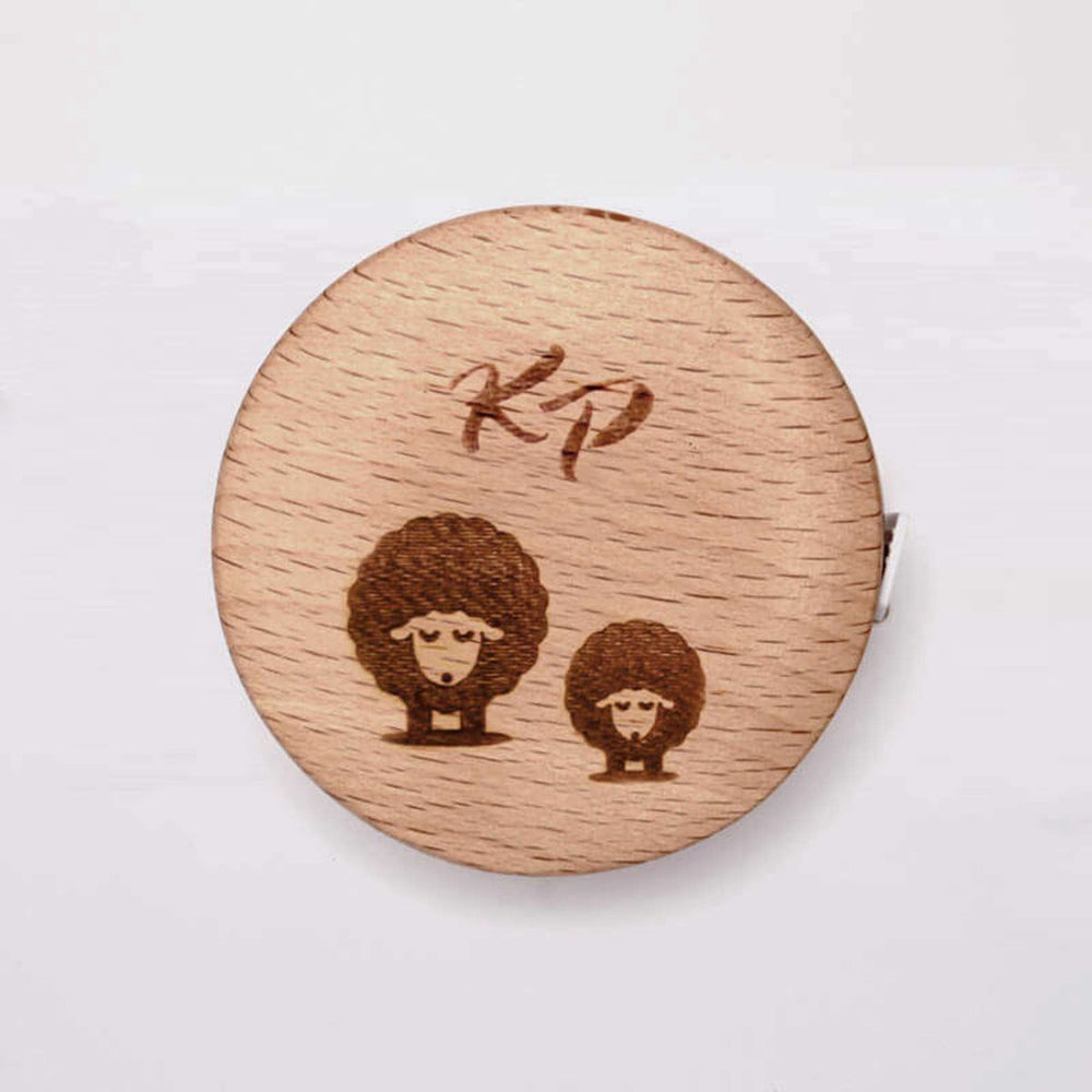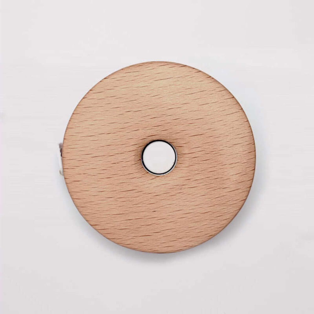 Målebånd fra KnitPro, som kommer i en smuk, rund træholder. Målebåndet er 150 cm langt. Du ruller det ud ved at trække i målebåndet og ruller det sammen igen ved at trykke i midten af blomsten på fronten af holderen.