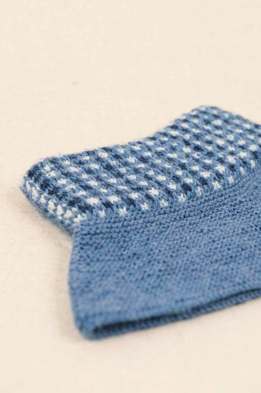 Halsedissens ternede krave er strikket vævestrik. Det nederste skulderparti er strikket rundt i retriller med én omgang ret og én omgang vrang. Opskriften indeholder en god beskrivelse af vævestrikmønstret, som gør halsedissen nem at gå til.