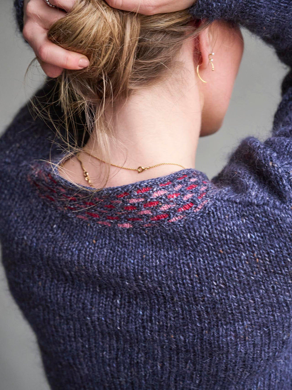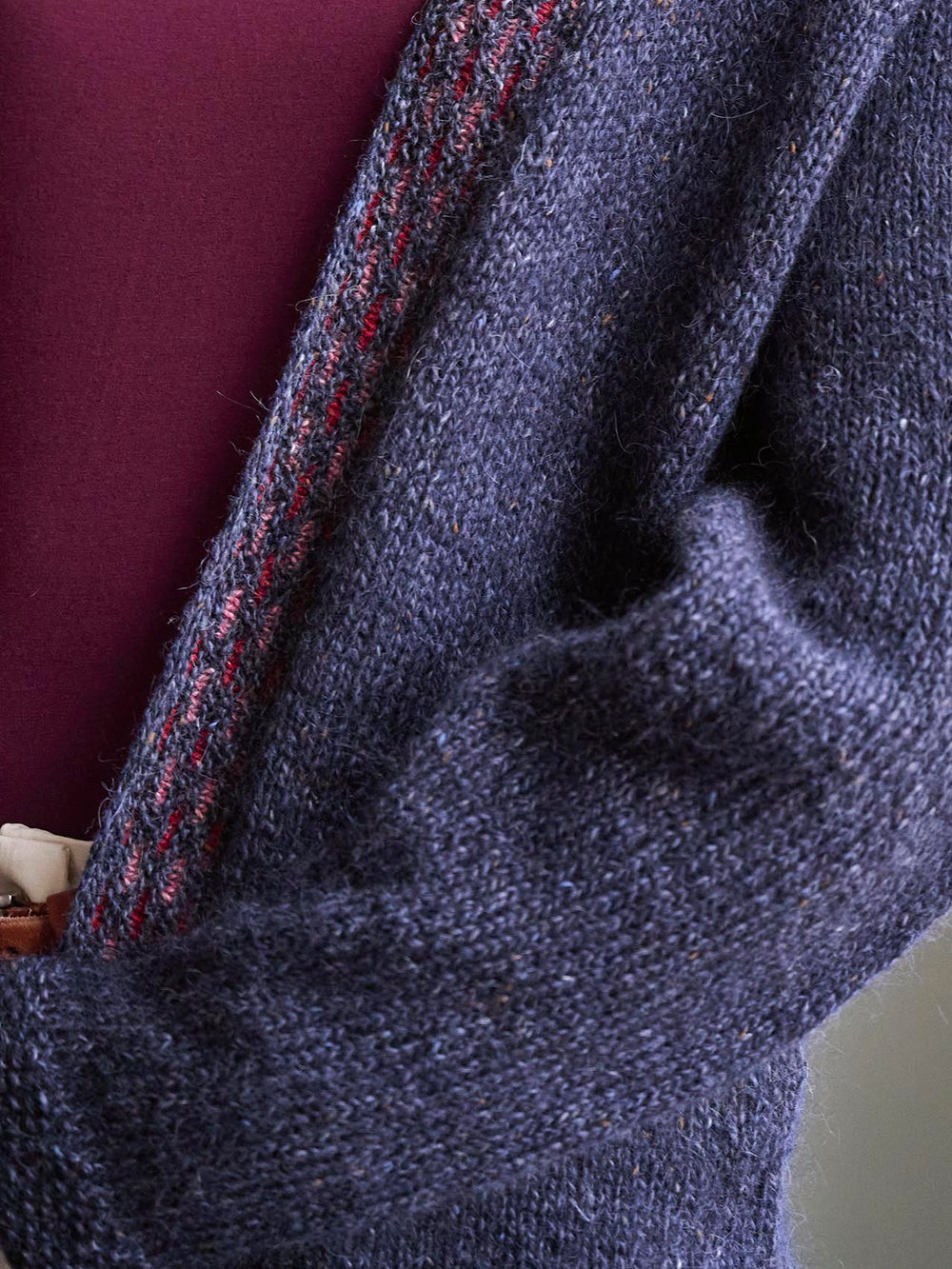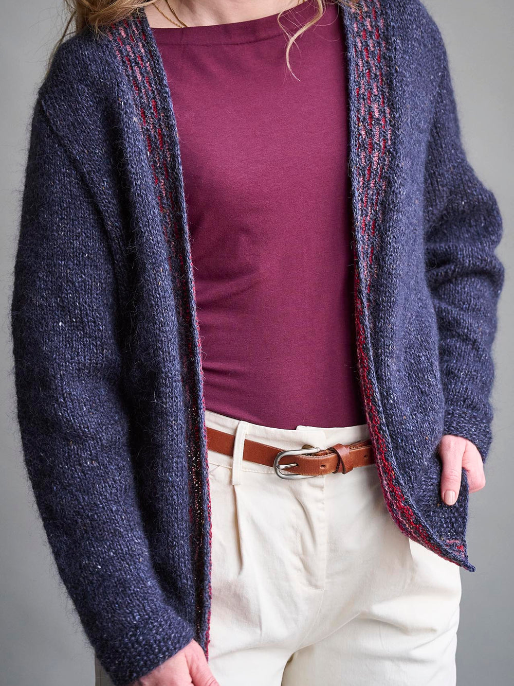 En smuk og let vamset cardigan med både tweednister og farvet mønster i vævestrik i kanten. Cardiganen strikkes nedefra og op med to tråde: én tråd Mayflower Birmingham + én tråd Mayflower Super Kid Silk. Og kombinationen er virkelig lækker. Birmingham er spundet på uld, alpaka og viskose og har de fineste tweednister.