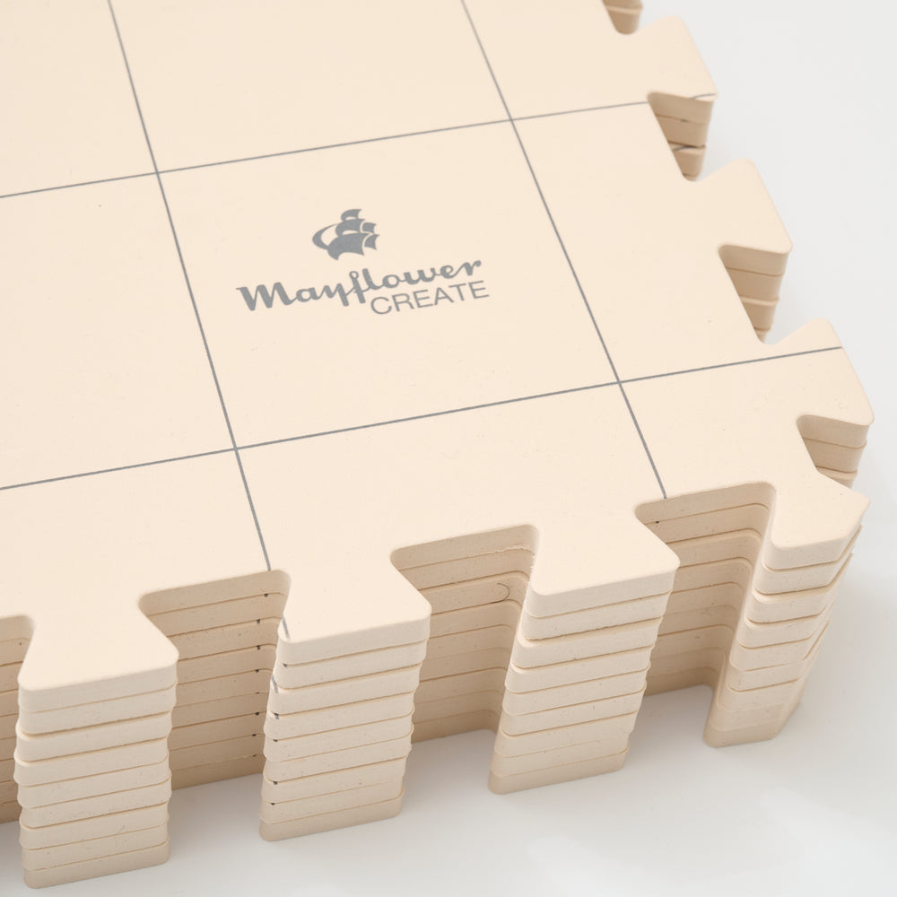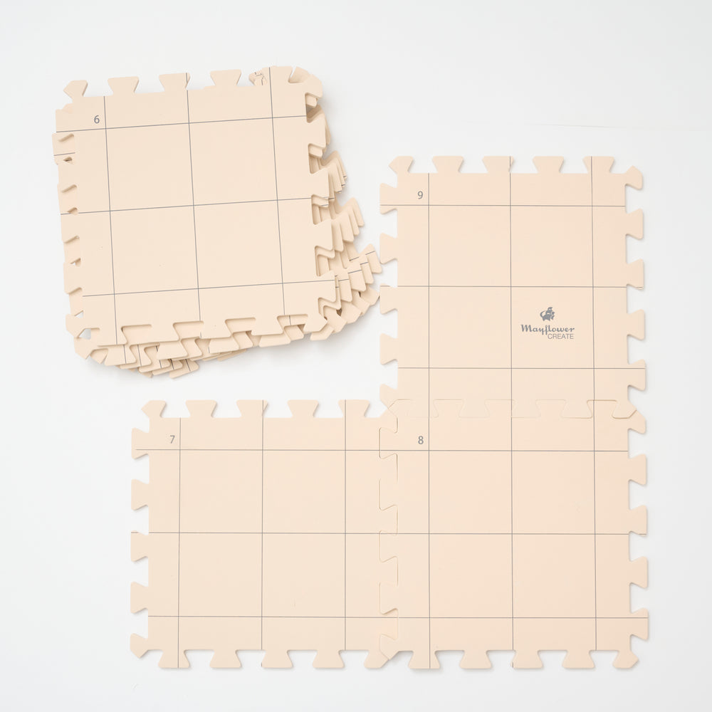 Sættet indeholder i alt 9 måtter på 32 x 32 cm, som kan sættes sammen én stor flade på 90 x 90 cm. Måtterne er lavet i blødt og holdbart skumplast, som sagtens kan holde til fugt fra vådt tøj, ligesom det også kan holde til blokking med nåle. Måtterne har et ternet design, hvor hvert felt måler 10 x 10 cm. Måtterne kommer i et filtcover.