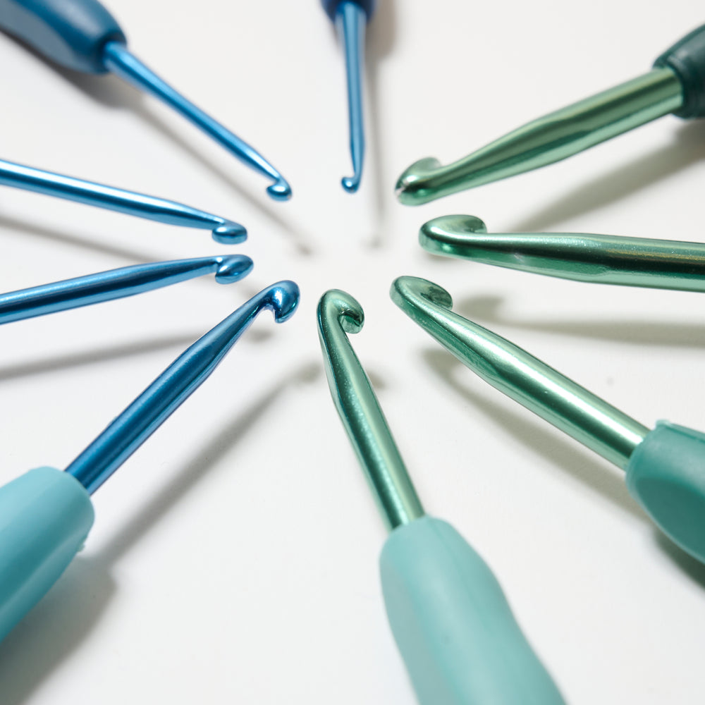 Hæklenålene er produceret i let aluminium med gummiskaft, hvilket giver et solidt greb.