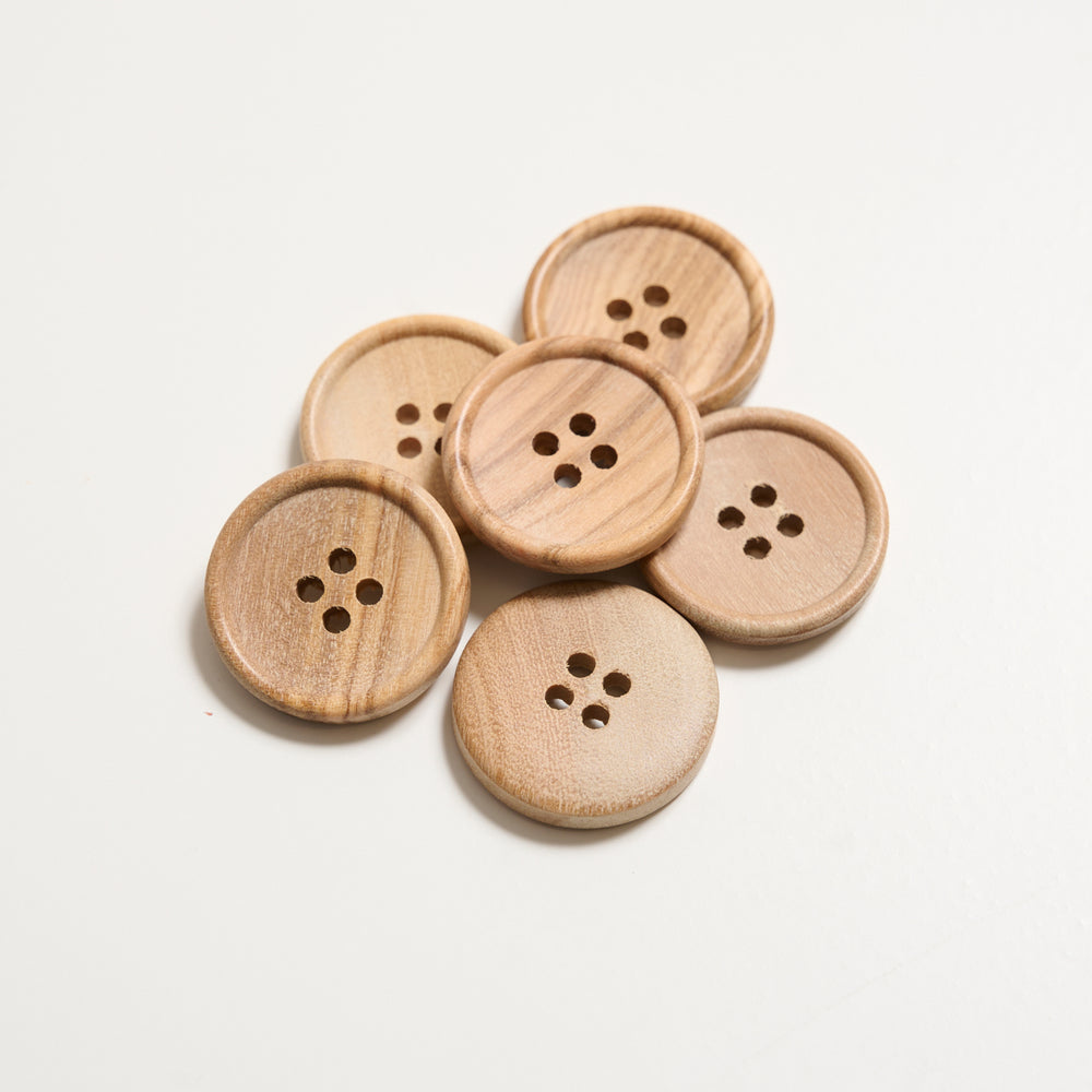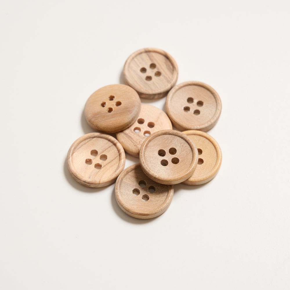 Helt almindelige træknapper med fire huller og en lille kant i seks forskellige størrelser fra 13-25 mm.