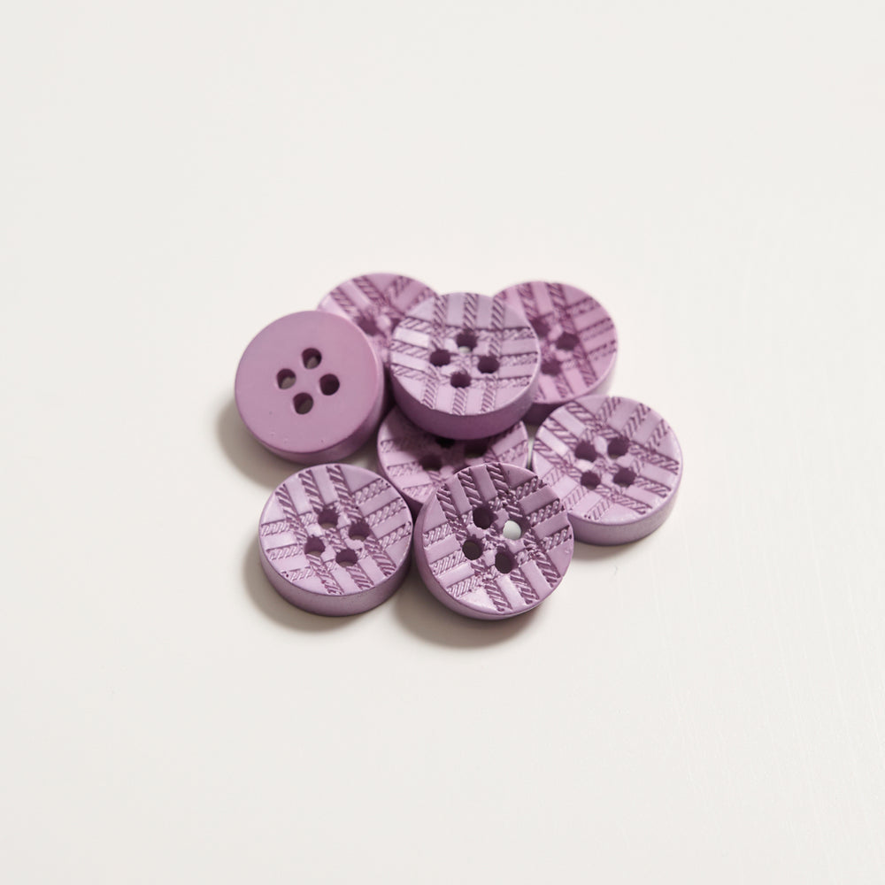 Mayflower Create knapper med fire huller i fire forskellige pastelfarver i en holdbar kvalitet. Den har et ternet mønster, der er præget ind i knappen. Mål: 11 mm. Antal: 8 stk.