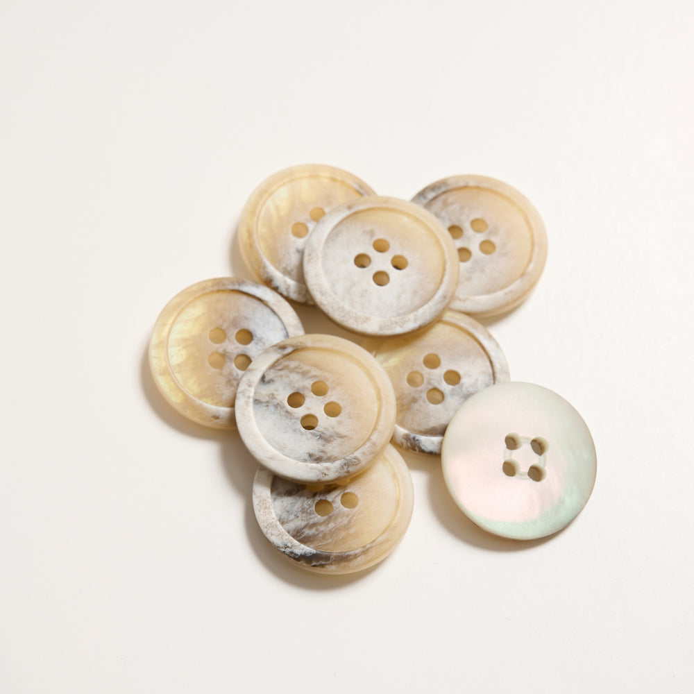 Knap med 4 huller i changerende, naturligt og shiny design. Mål: 15mm - 18mm - 20mm. Antal: 8 stk.