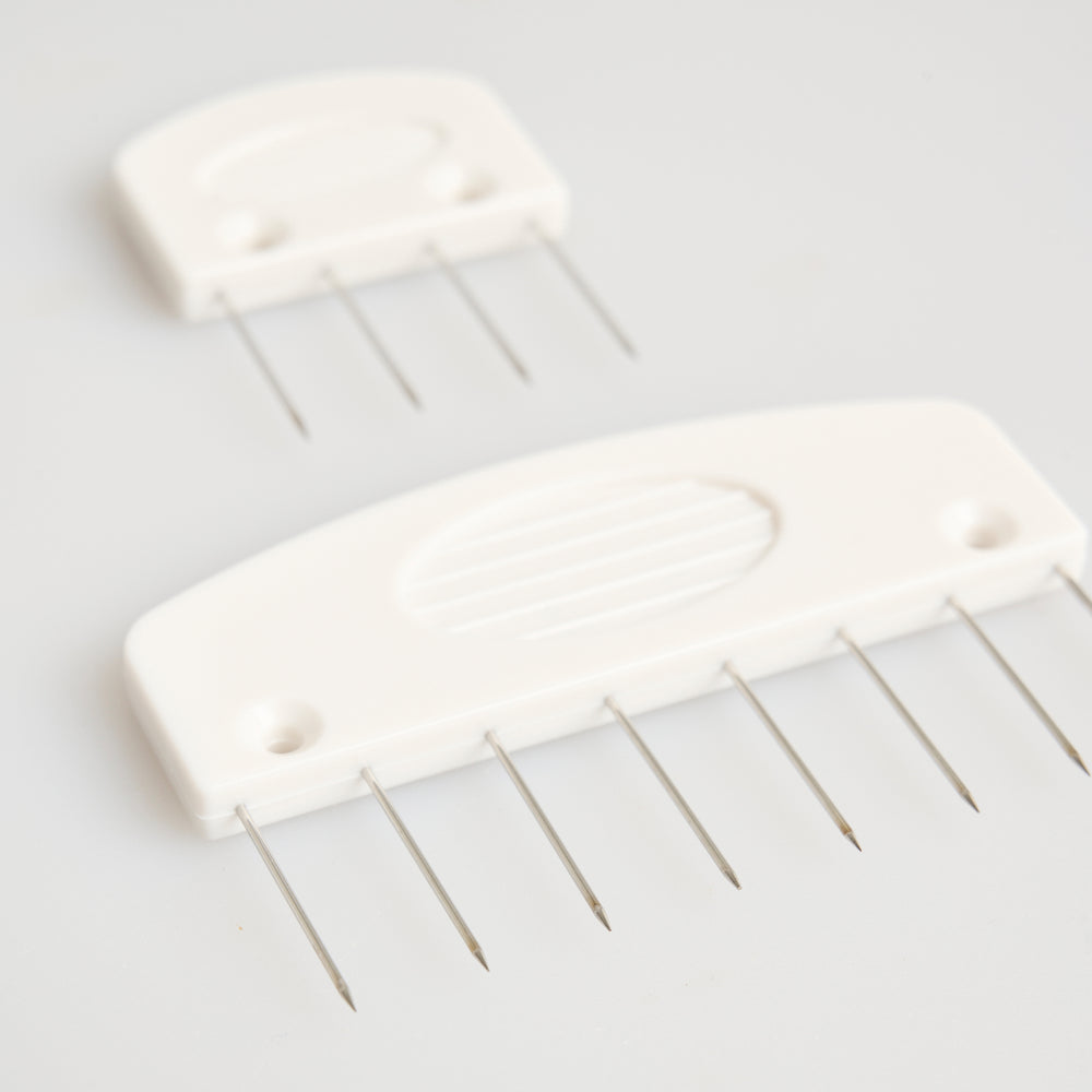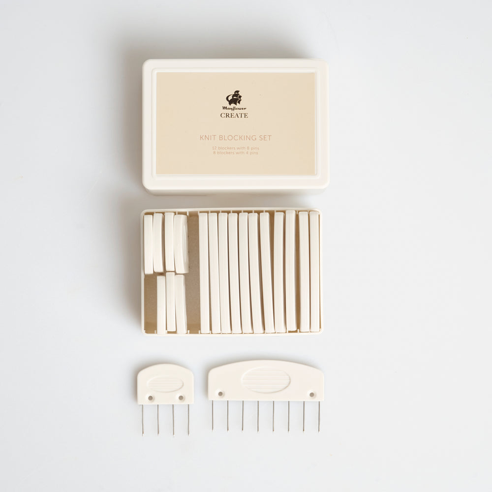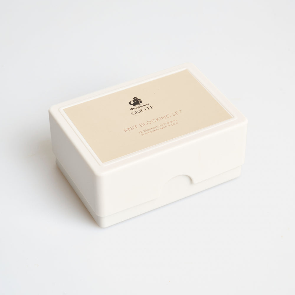 Strikkeblokkere, som bruges til udspænding eller såkaldt blokking af fx hæklet eller strikket beklædning, så det kommer ud i de rigtige mål, når det skal liggetørre. For at sikre, at den våde sweater har den rigtige form, når den er tør, skal du forme den, mens du ligger den til tørring. For at holde bedst muligt på formen undervejs bruges disse strikkeblokkere i kanten af sweateren. Når sweateren spændes ud på en blokkingmåtte i skumplast, er det nemt at placere nålene i måtten.