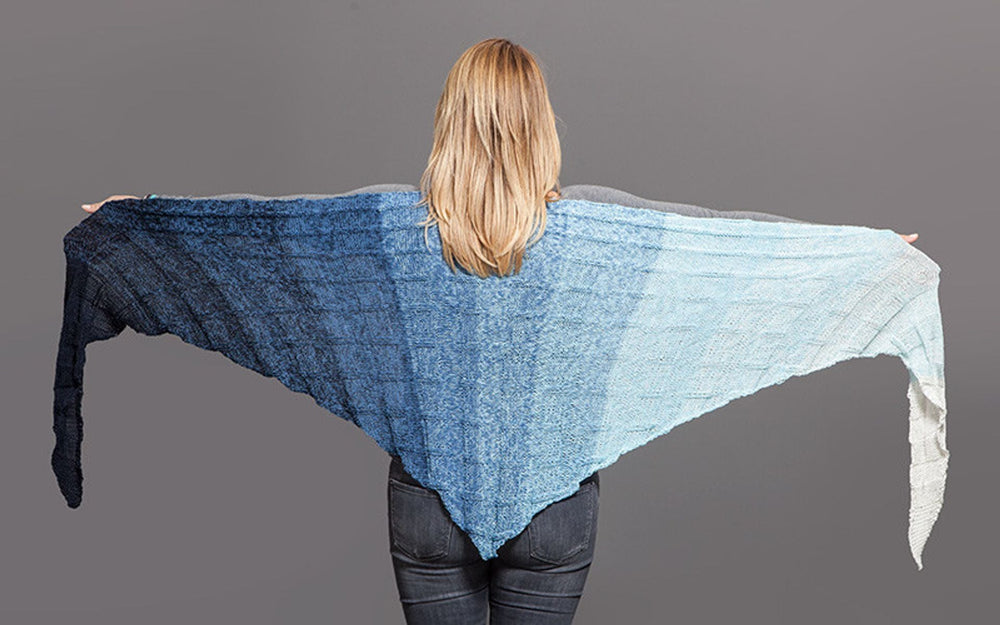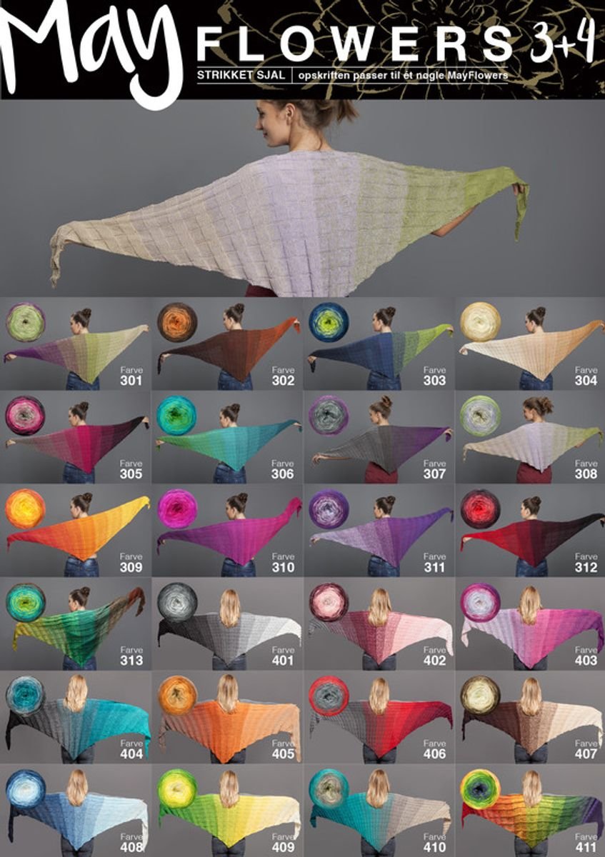 Lækkert sjal strikket i Mayflower 3 eller 4. Kvaliteten har langt farveskift, består af 50% akryl og 50% bomuld og er lækker og let at strikke i.