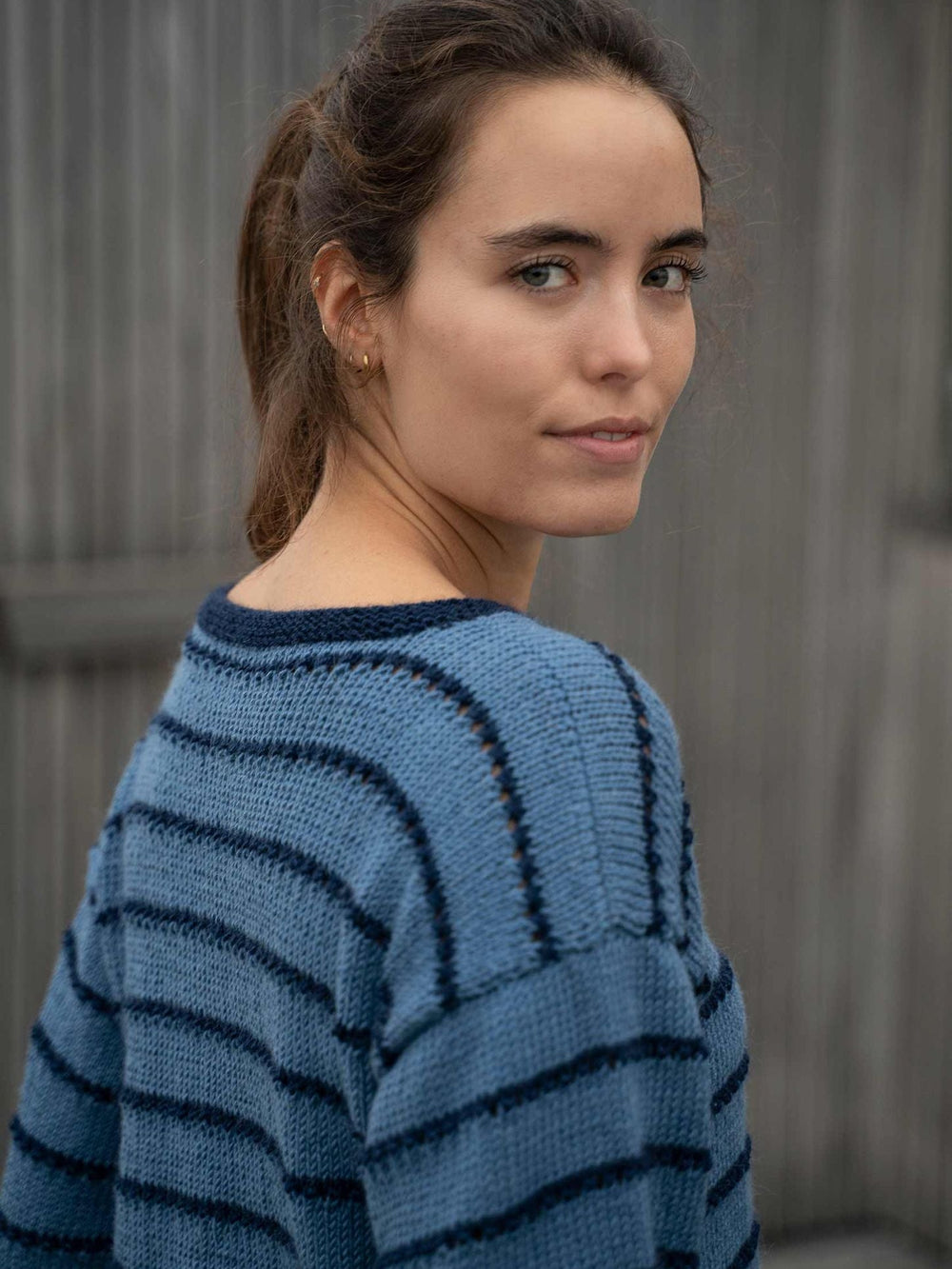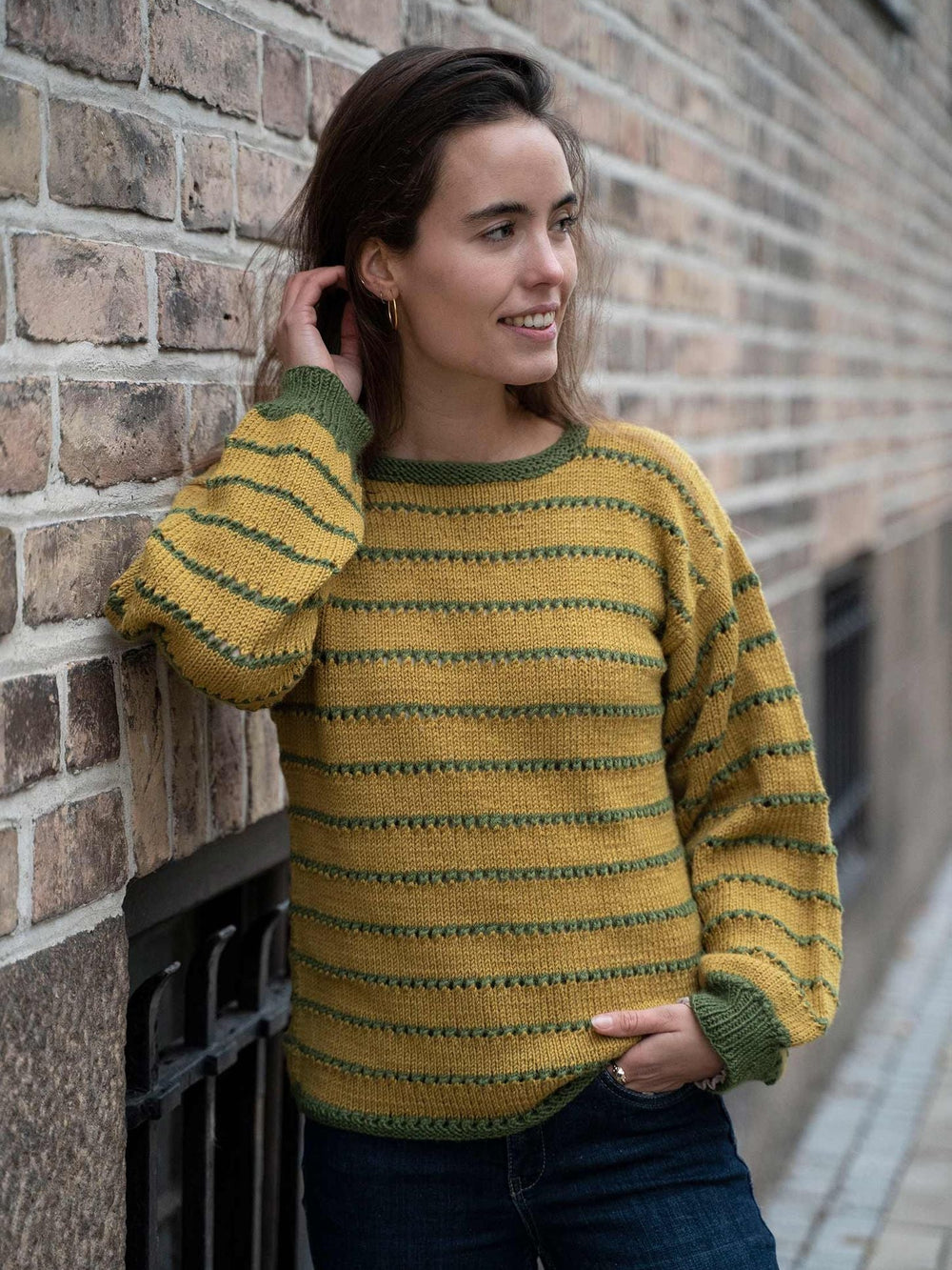 Mette sweateren er en fin og enkel sweater, som er perfekt til hverdagsbrug. Sweateren er strikket med striber i to forskellige farver. I vores udgaver af sweateren har vi valgt en lysere grundfarve, som suppleres af striber i en lidt mørkere farve.
