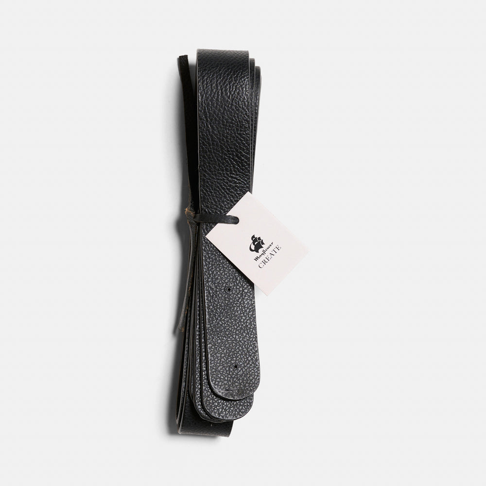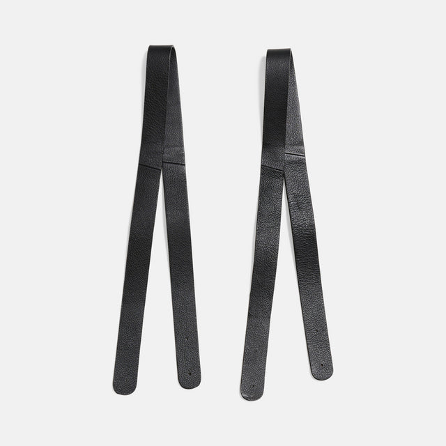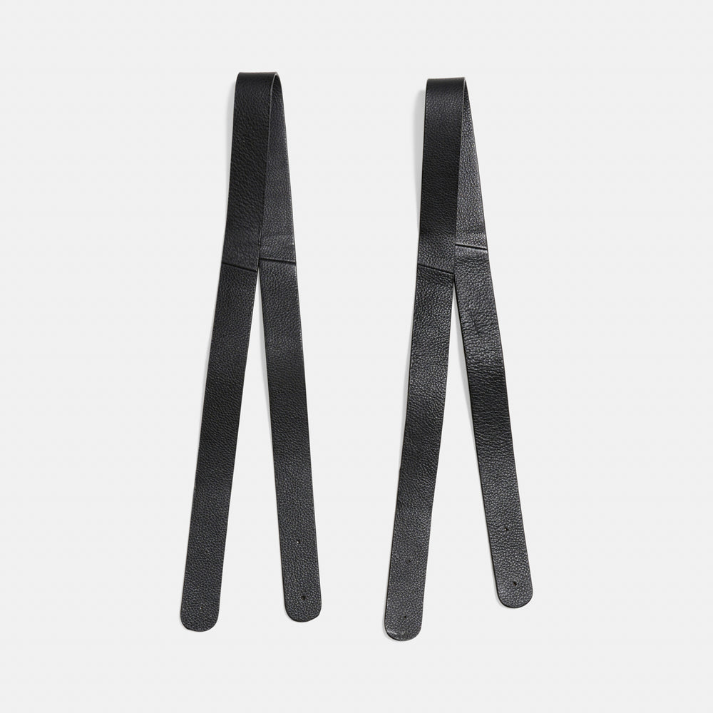 2 taskehanke, som er håndlavede i ægte læder. Taskehankene kan monteres med nitter på fx en hæklet taske. Hankene er 80 cm lange og 2,5 cm brede med en tykkelse på ca. 2,5-3 mm. Taskehankene fås i enten sort eller brun.