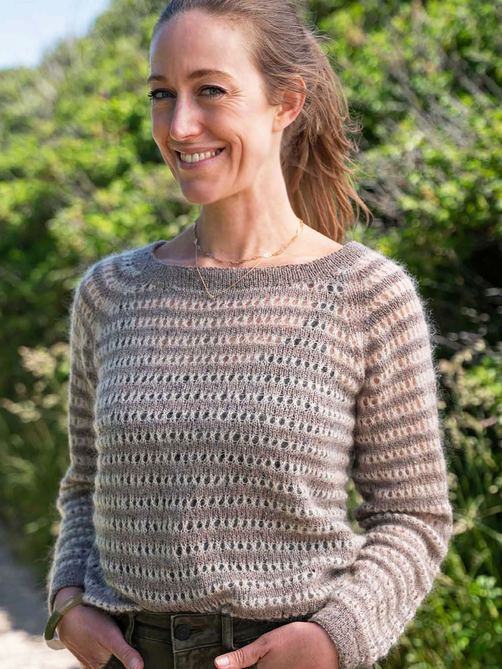 I Michelle blusen leges der med struktur, da der strikkes striber med to forskellige garnkvaliteter. Dette giver en unik effekt med ekstra kontrast.