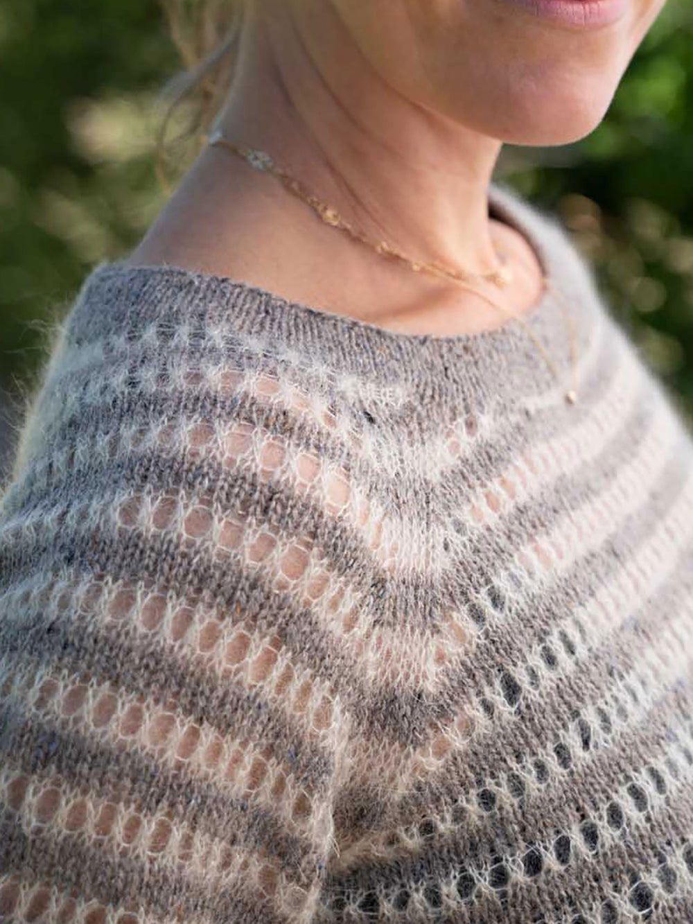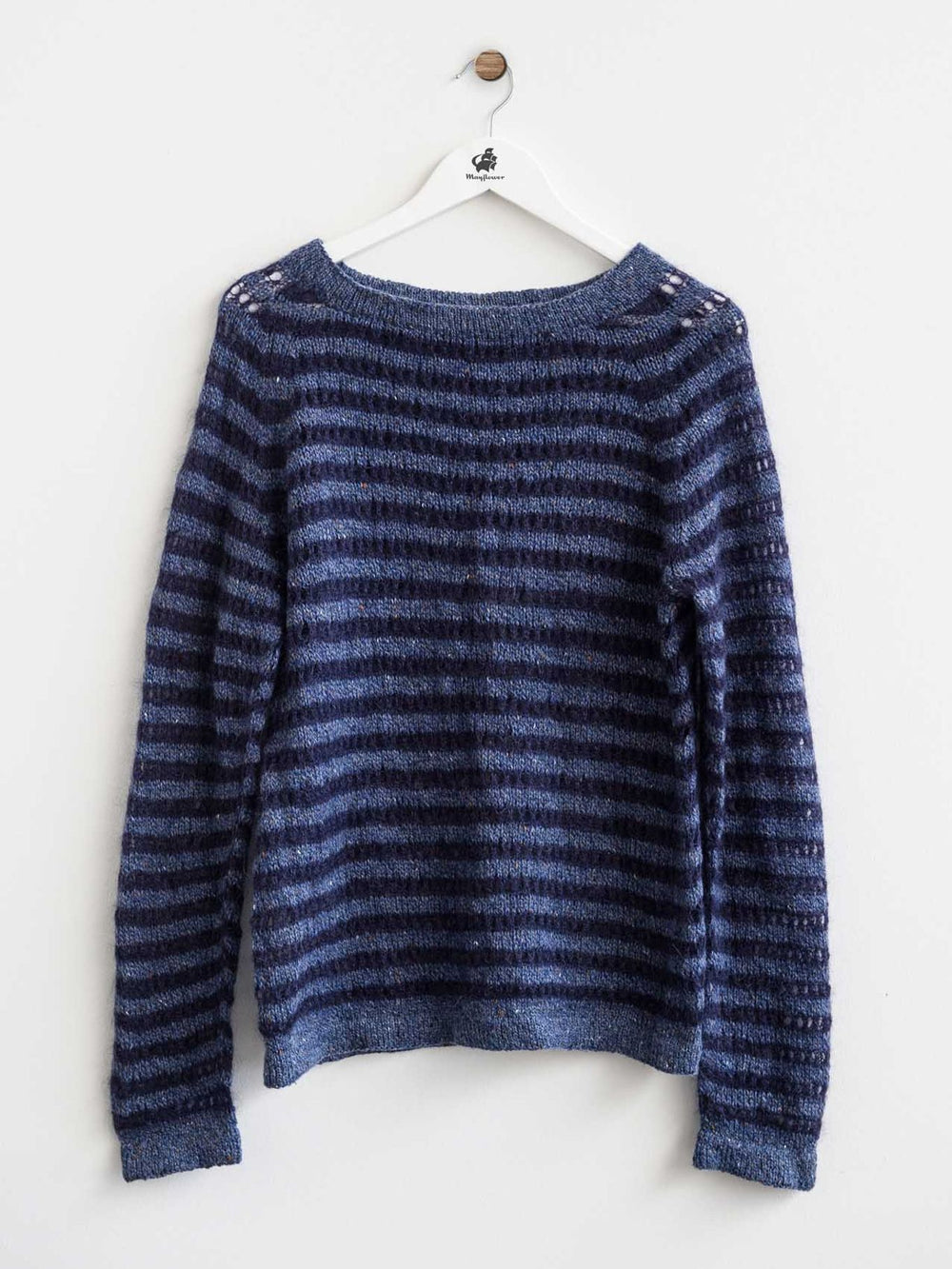 Den anden garnkvalitet er Mayflower Super Kid Silk, som er en tynd og luftig kombination af mohair og silke. Disse striber strikkes med hulmønster, hvilket giver en endnu større kontrast til de solide striber af Mayflower Birmingham.