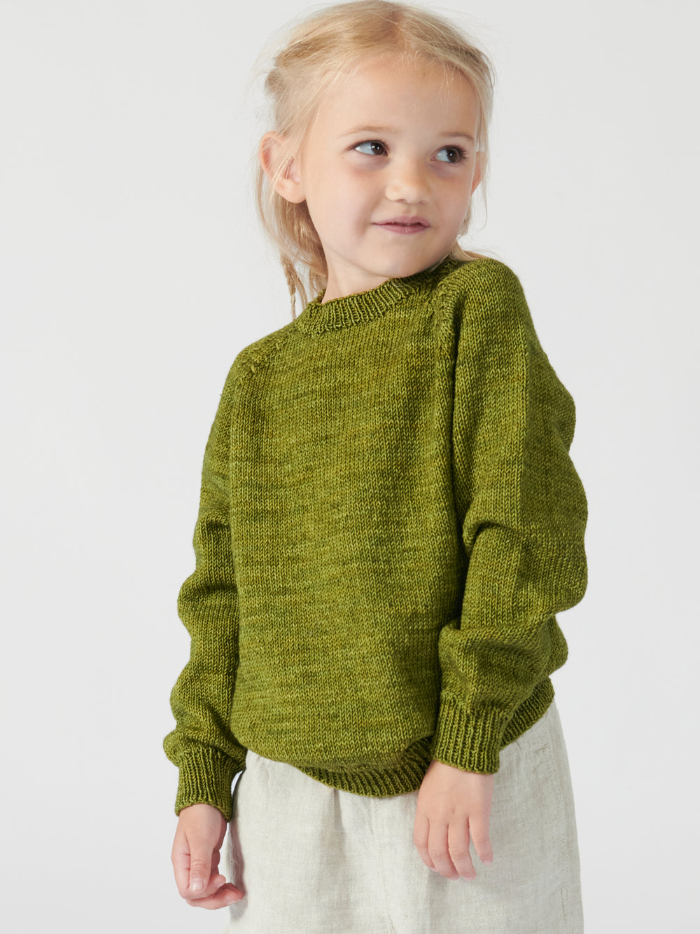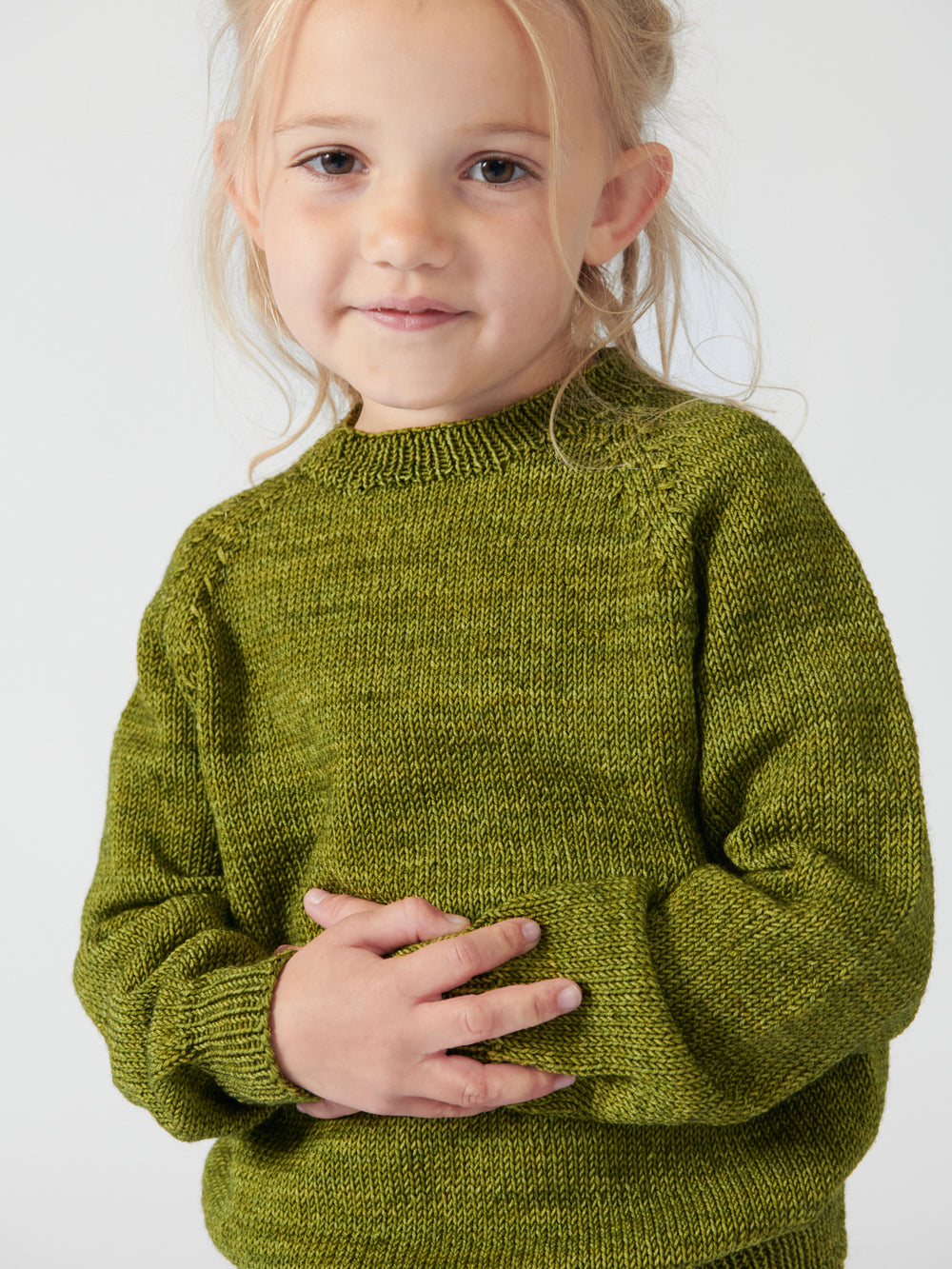 Mie sweater junior er en raglansweater, som strikkes nedefra og op i glatstrik og med kanter i rib.