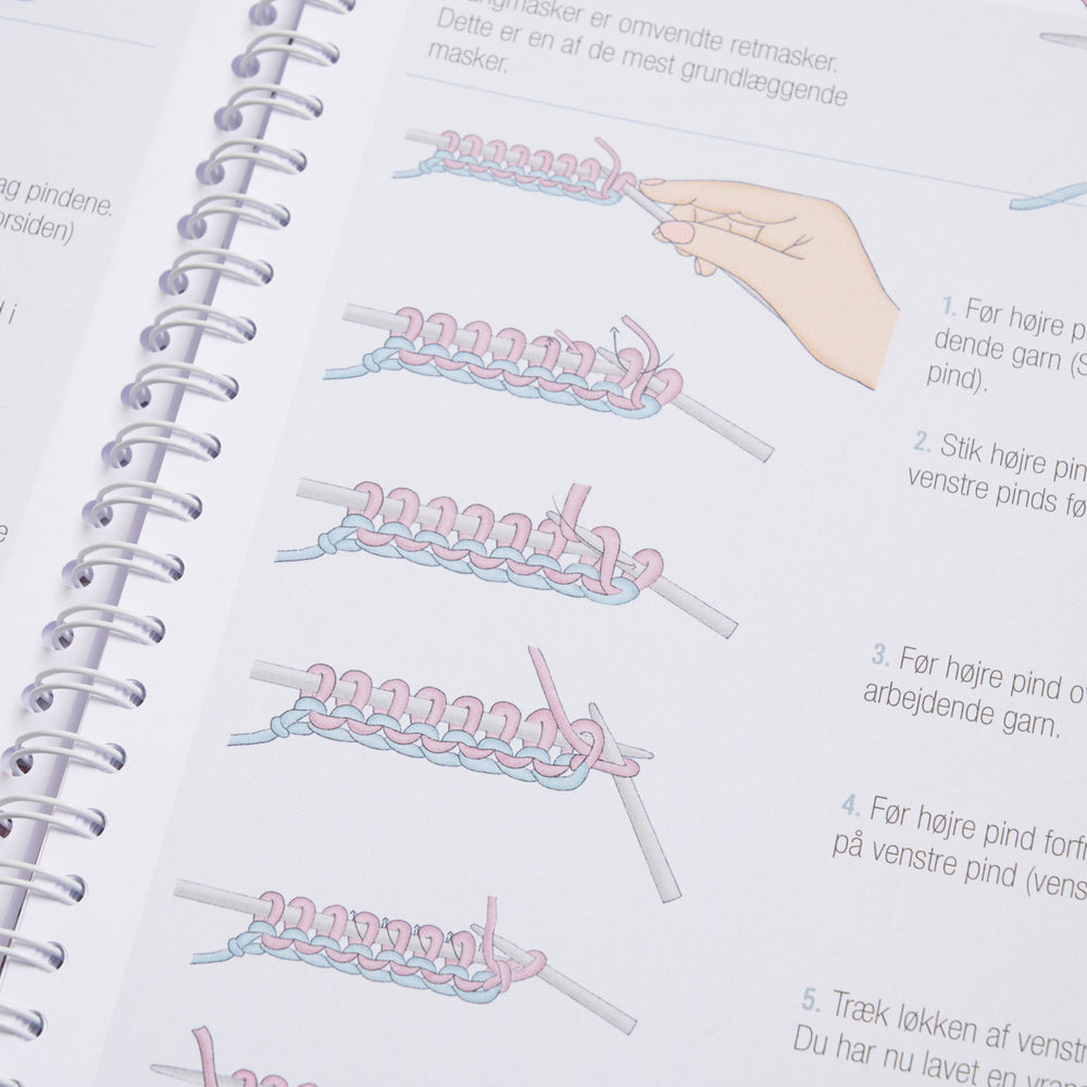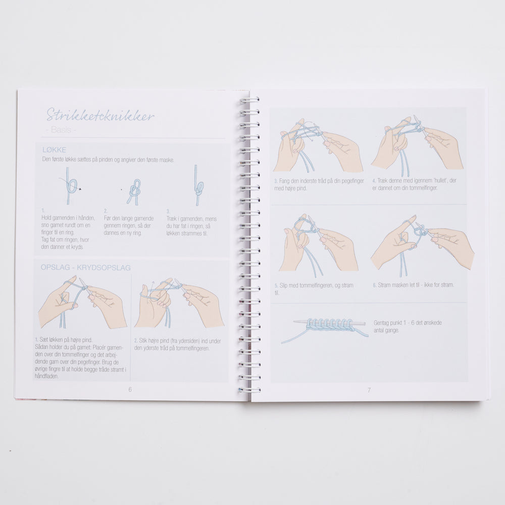 Journalen har sider med plads til at klippe og klistre fx strikkeprøver fast.
