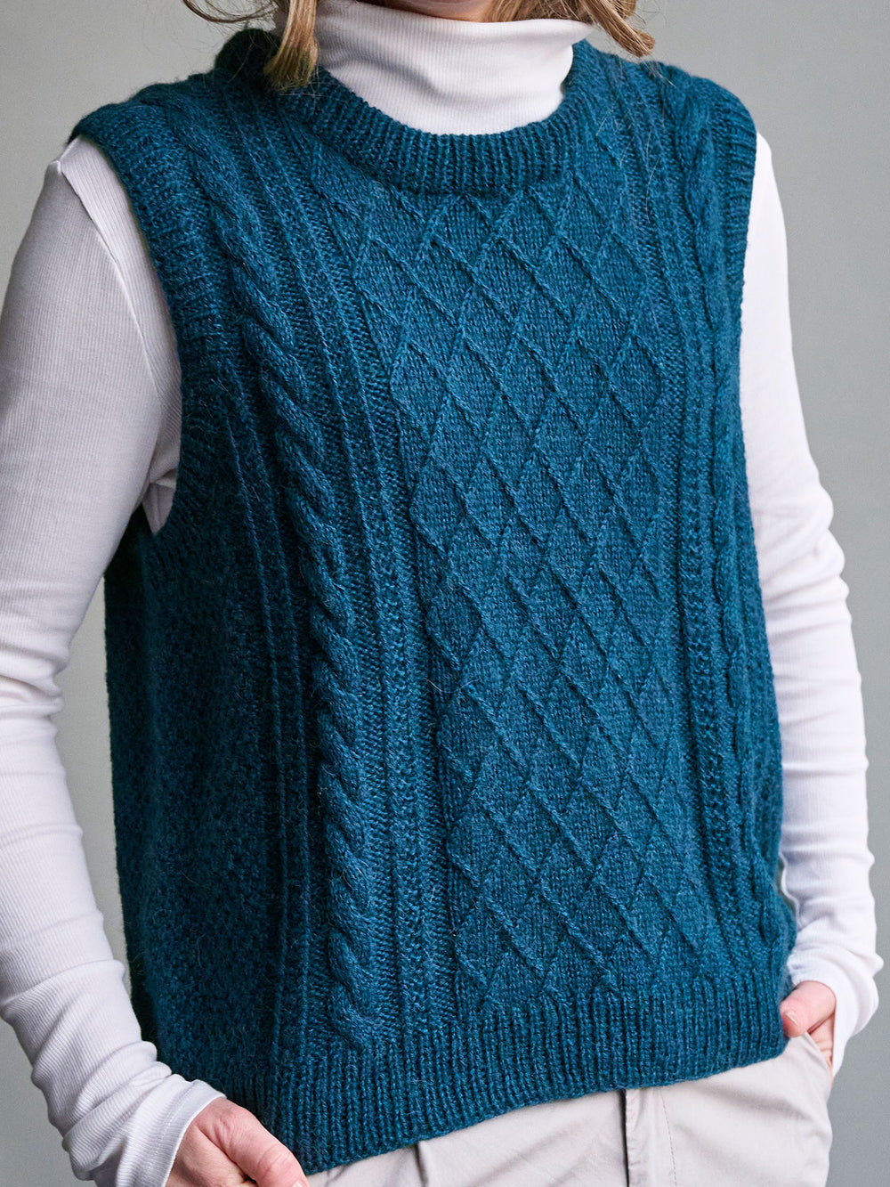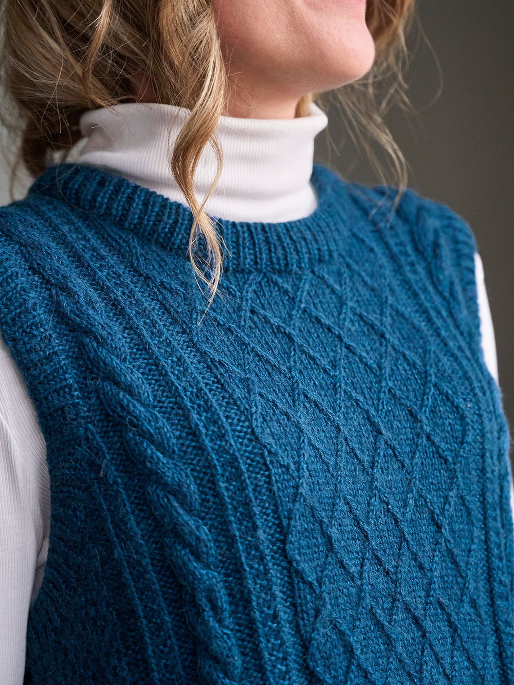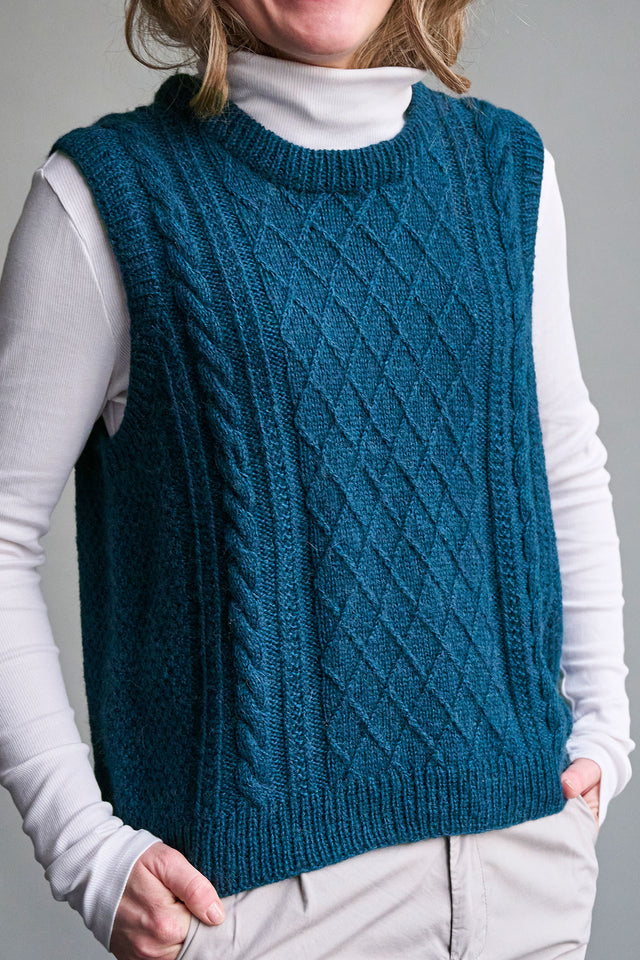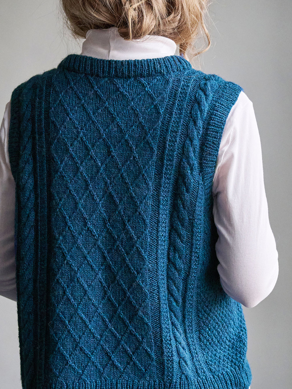 Moby slipover fra PetiteKnit er strikket oppefra og ned med snoninger og strukturstrik på både for- og bagstykke. Kanter strikkes i rib.