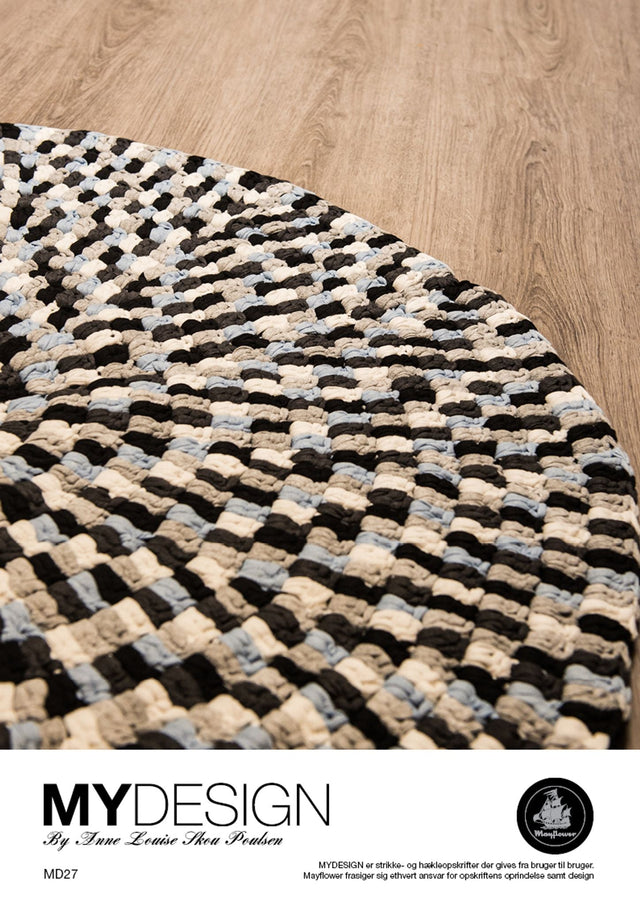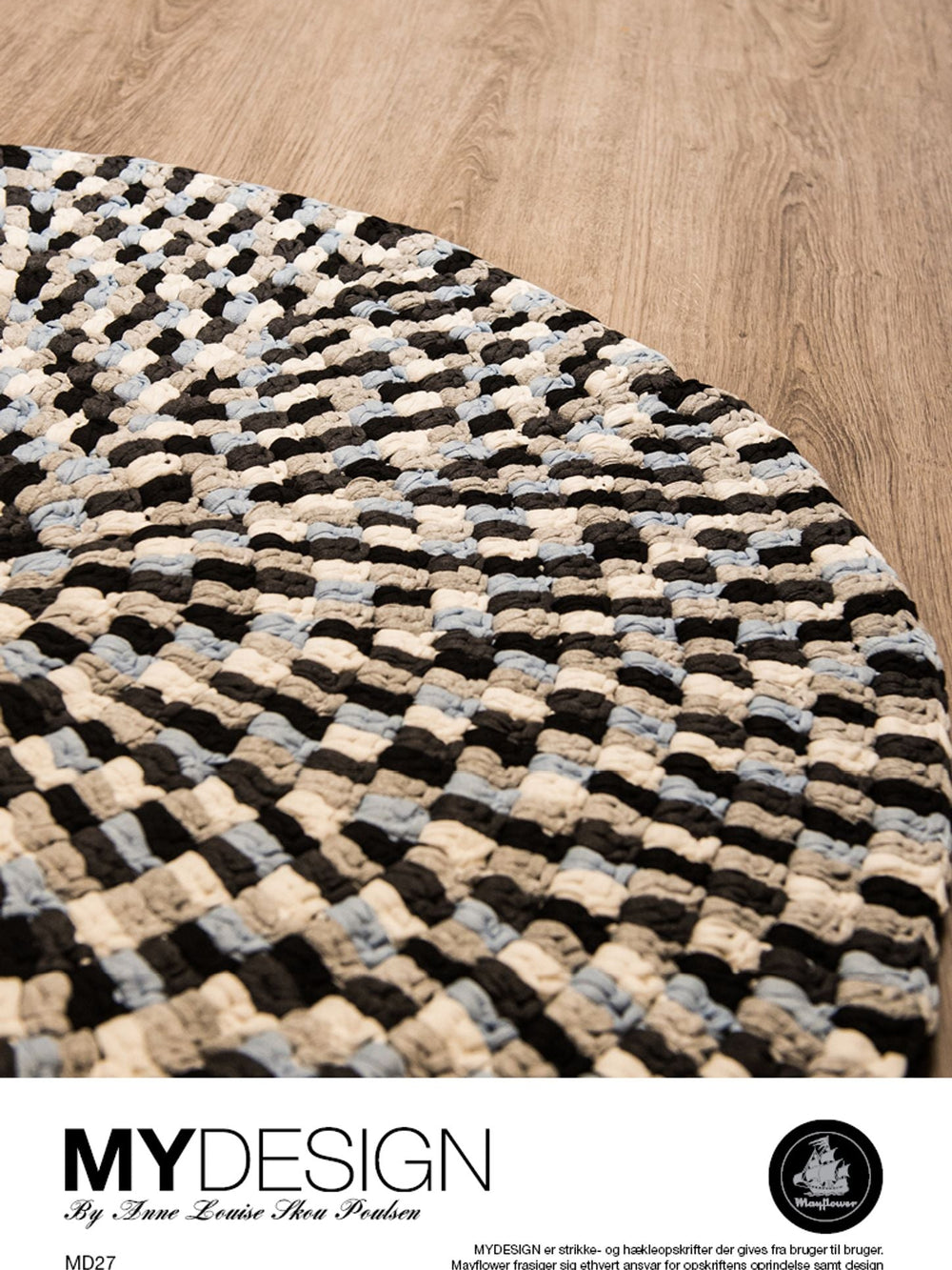 Det flotte tæppe er lavet i båndgarnet Mayflower Ribbon, som giver et flot og solidt gulvtæppe. Designet er lavet af Anne Louise Skou Poulsen, @annelouisesp. MYDESIGN er strikke- og hækleopskrifter, der gives fra bruger til bruger. Mayflower frasiger sig ethvert ansvar for opskriftens oprindelse samt design.
