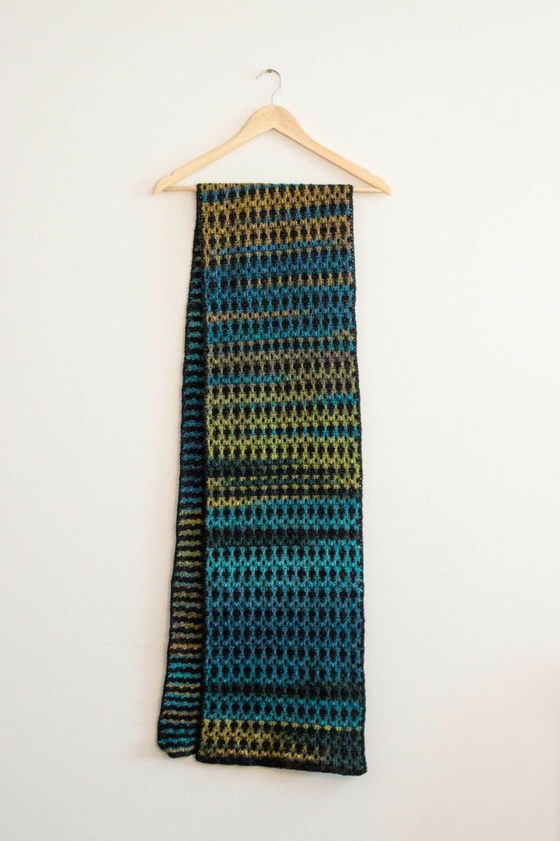 Langt, smukt tørklæde, som hækles i den fine teknik mosaikhækling med reliefmasker. Tørklædet måler 30 x 200 cm og har derfor en god længde.