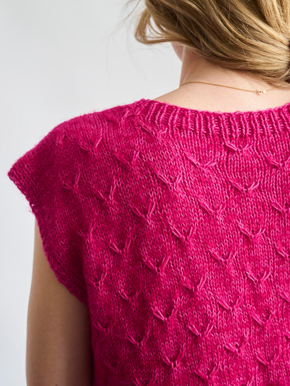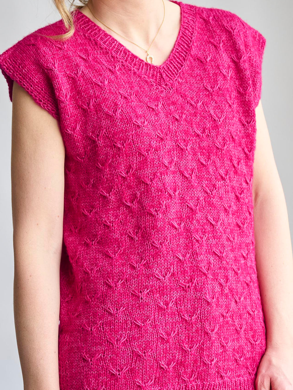 Flot og enkel vest med slids i begge sider og et gennemgående strukturmønster, som giver en smuk effekt. Vesten strikkes nedefra og op i en kombination af Mayflower Duette og Mayflower Premium Cassandra. Garnet er derfor også med til at give vesten lidt farvespil.