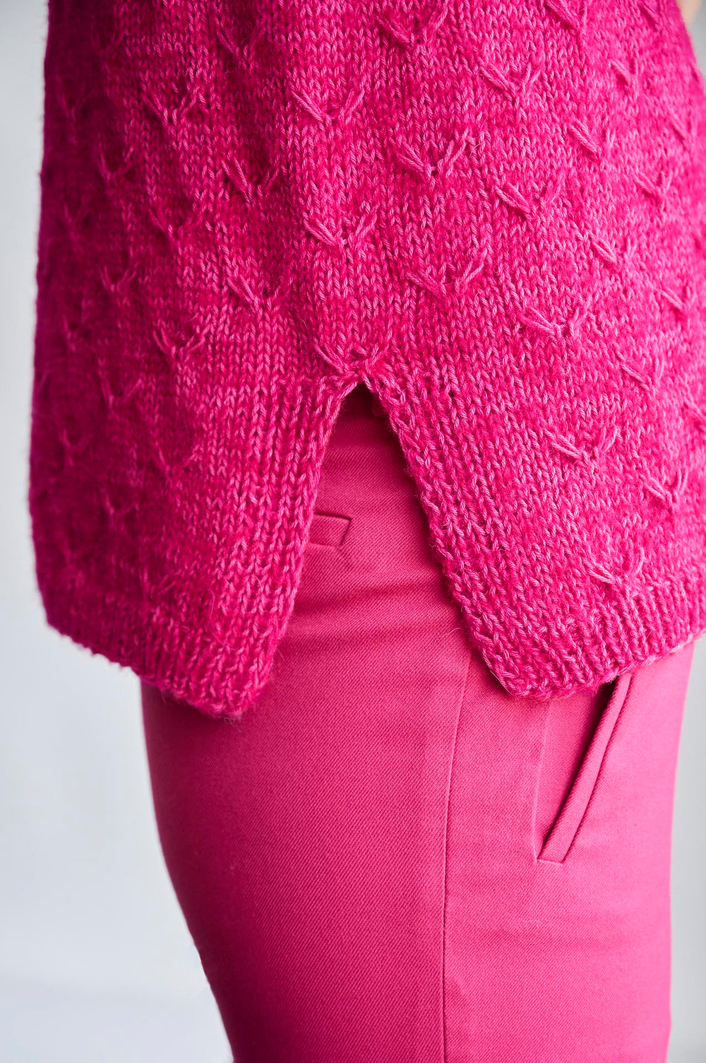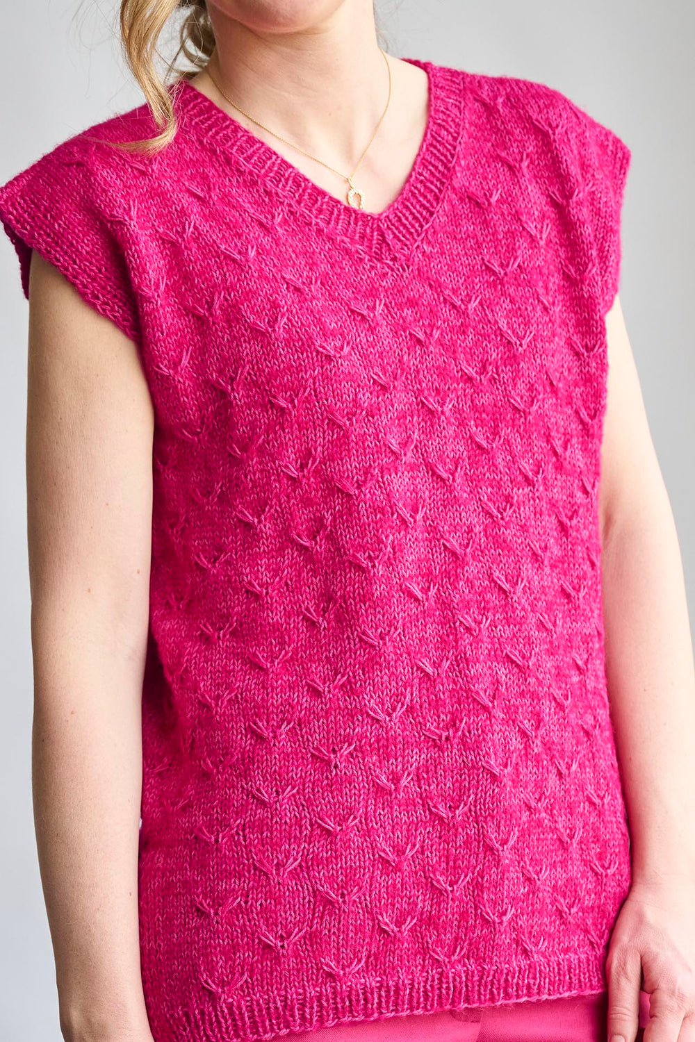 Flot og enkel vest med slids i begge sider og et gennemgående strukturmønster, som giver en smuk effekt. Vesten strikkes nedefra og op i en kombination af Mayflower Duette og Mayflower Premium Cassandra. Garnet er derfor også med til at give vesten lidt farvespil.