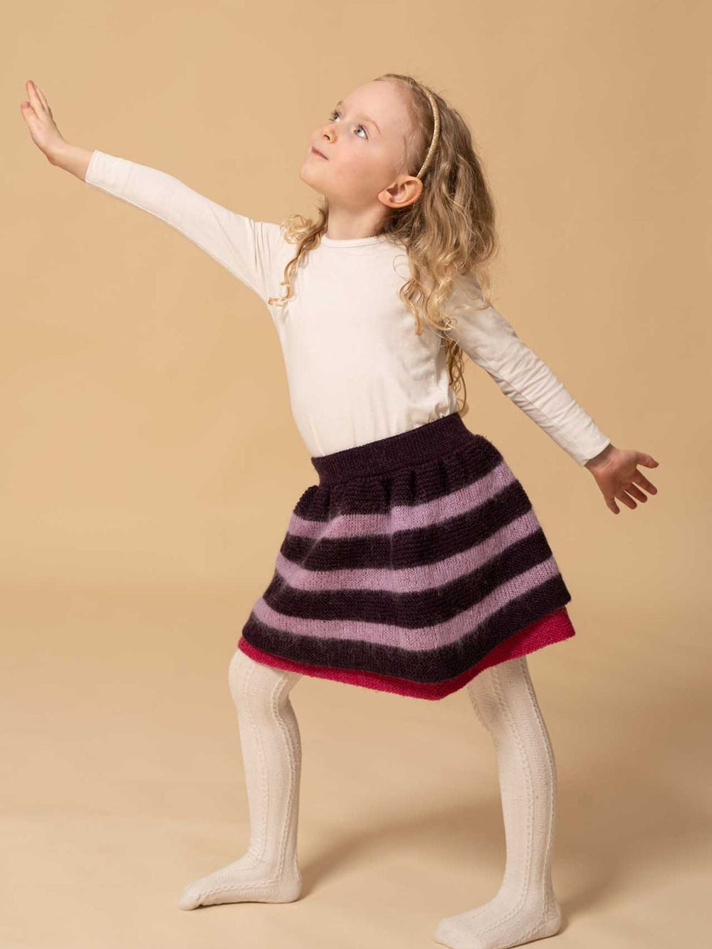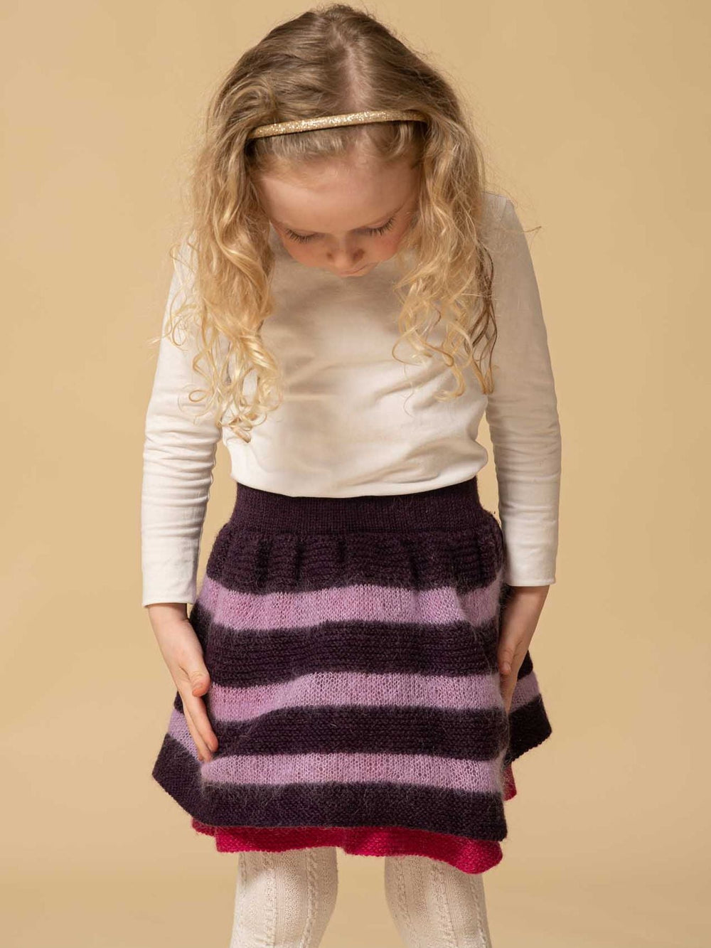 Nannas Skørt har en fin og struttende form. Det er muligt, fordi skørtet har en optimal kombination af lethed og fylde, som opnås igennem et unikt garnvalg. Skørtet er strikket i striber i skiftevis Mayflower Easy Care og Mayflower Super Kid Silk. Det giver striber med forskellige struktur, for Easy Care er traditionelt uldgarn, mens Super Kid Silk er en blanding af mohair og silke.