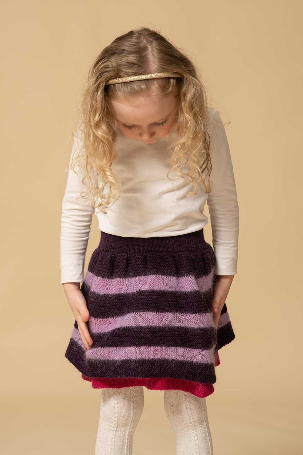 Nannas Skørt har en fin og struttende form. Det er muligt, fordi skørtet har en optimal kombination af lethed og fylde, som opnås igennem et unikt garnvalg. Skørtet er strikket i striber i skiftevis Mayflower Easy Care og Mayflower Super Kid Silk. Det giver striber med forskellige struktur, for Easy Care er traditionelt uldgarn, mens Super Kid Silk er en blanding af mohair og silke.
