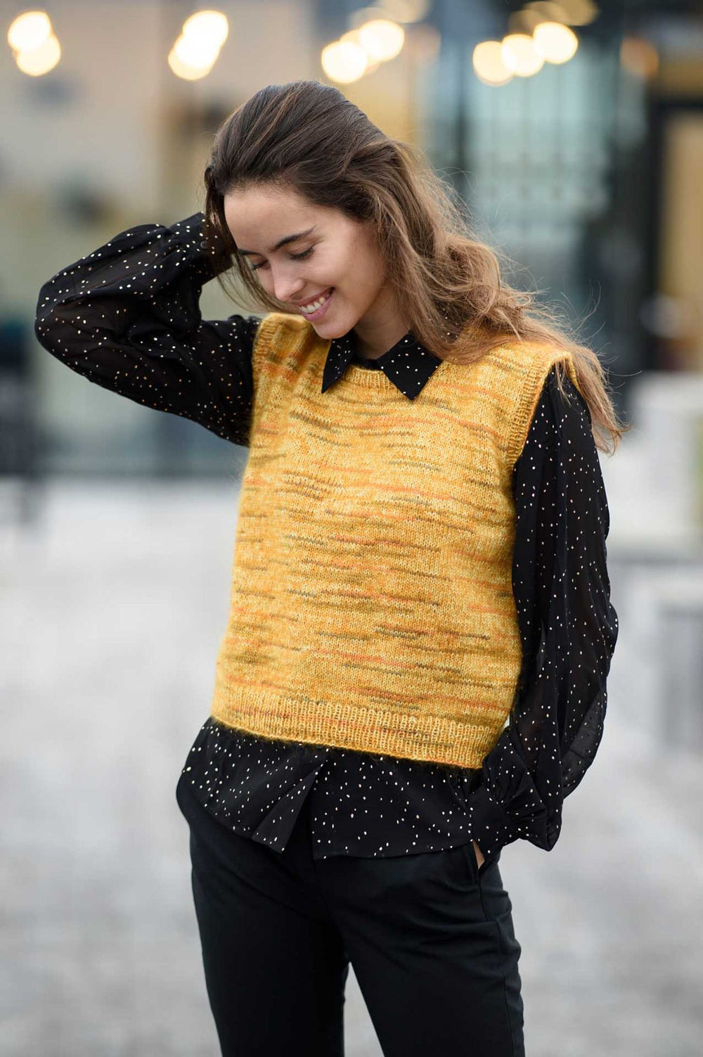 Natalie slipover er en skøn vest, som er helt ufatteligt lækker at have på. Den er strikket i én tråd Mayflower Honeybee Print og én tråd Mayflower Super Kid Silk, og tilsammen giver det én af de blødeste garnkombinationer med det flotteste farvespil pga. printet fra Honeybee Print.