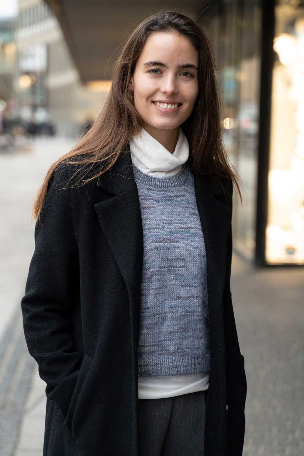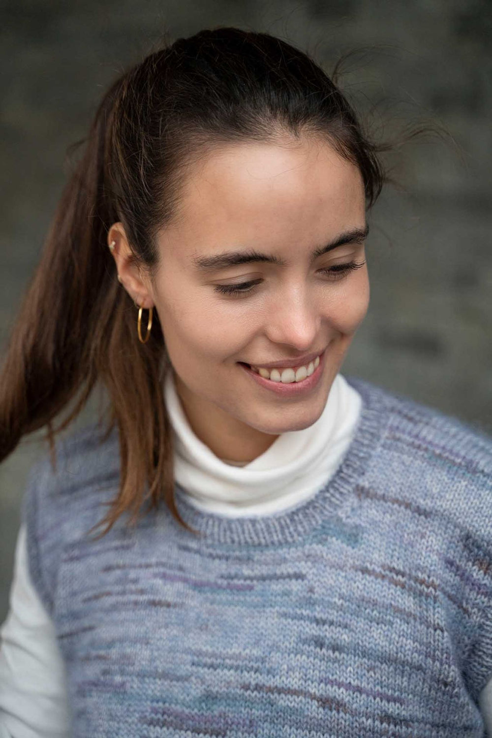 Natalie slipover er strikket oppe fra og ned. Først strikkes det øverste af ryggen, og derefter strikkes der masker op på hhv. venstre og højre skulder. Til sidst samles det hele, når halsudskæringen er færdig, og resten strikkes rundt. Til slut strikkes der ribkanter for at give den helt rigtige pasform.