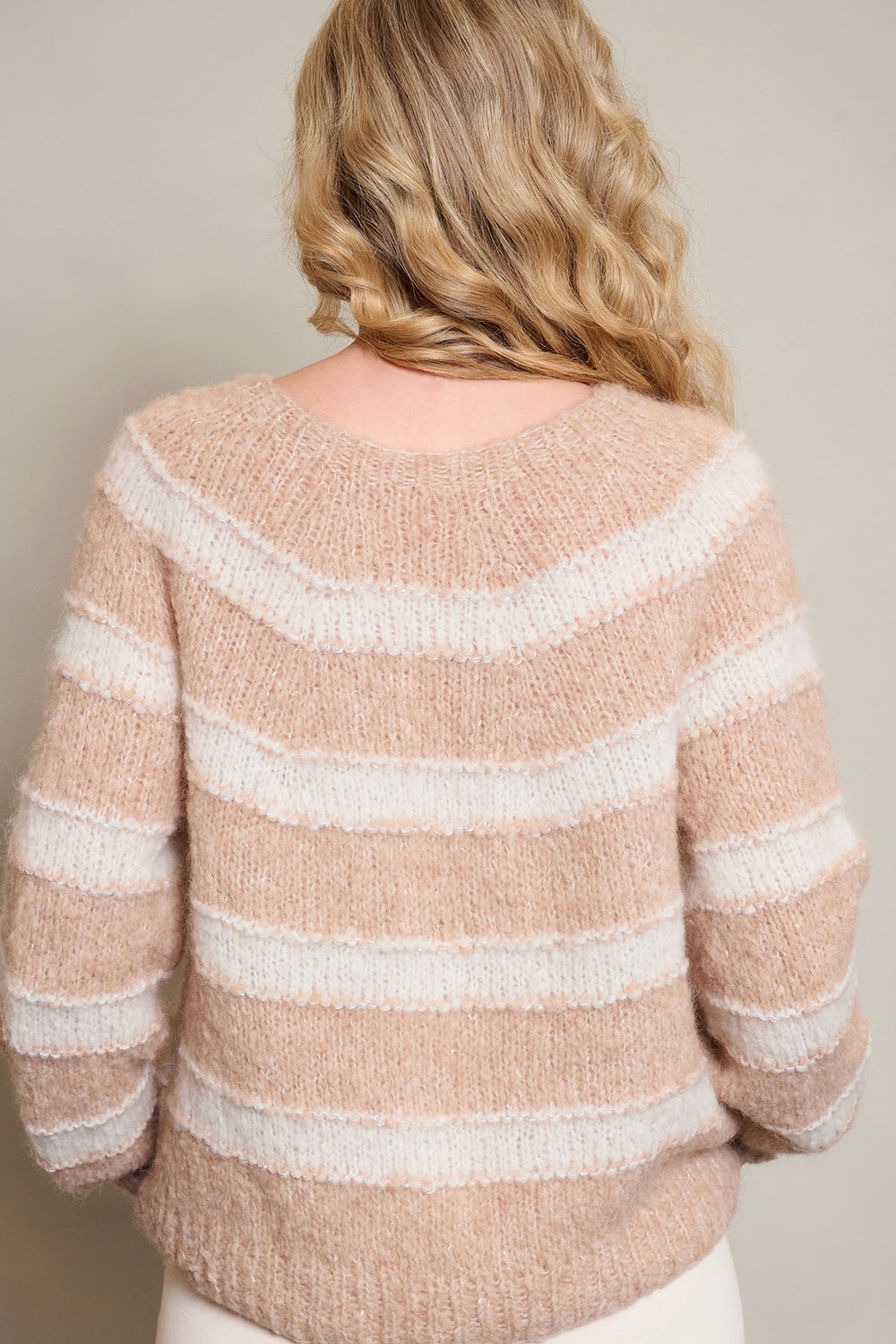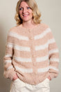 Stribet og vamset cardigan, som strikkes oppefra og ned.
