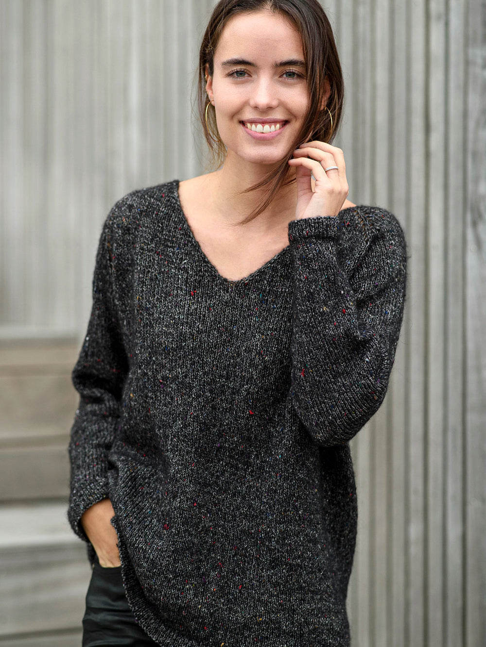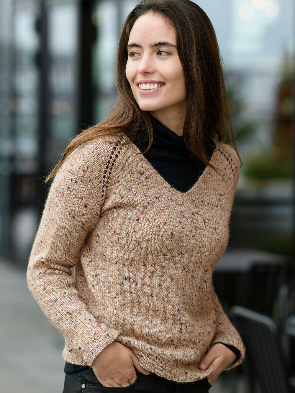 Casablanaca Lux er en garnkvalitet med masser af personlighed. Derfor er garnet især velegnet til enkle designs som for eksempel Nina Sweateren. Her får garnets fine detaljer virkelig lov at komme til sin ret og fremhæver samtidig sweaterens enkle detaljer.
