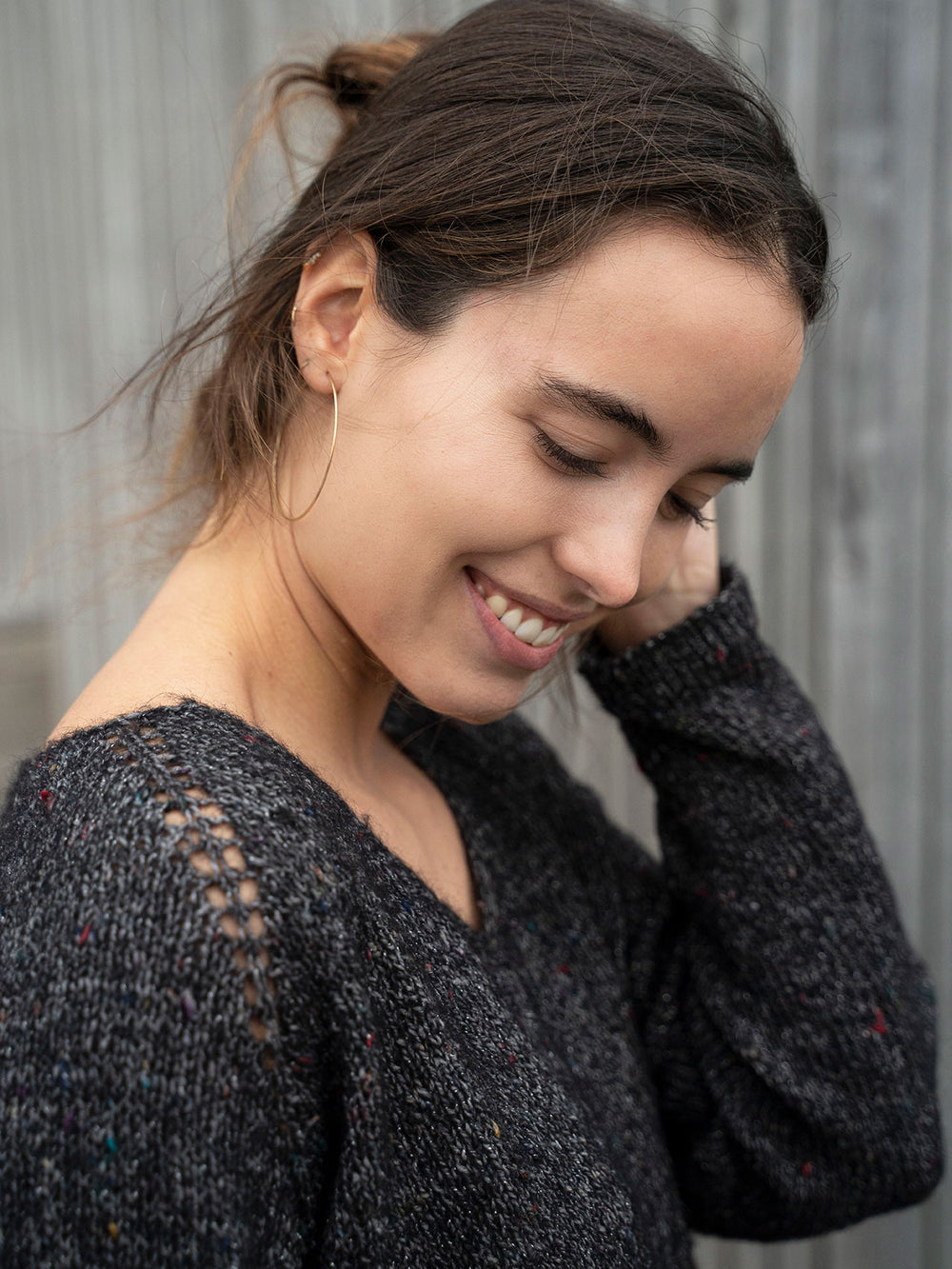 Sweateren har en almindelig løs pasform med et bevægelsesrum på 4 cm. Det gør den en anelse løstsiddende og meget komfortabel, men den er ikke direkte oversize. Samtidig har sweateren også en række fine detaljer som for eksempel skulderudtagningerne, der fremhæves af et smukt hulmønster samt den brede v-hals.