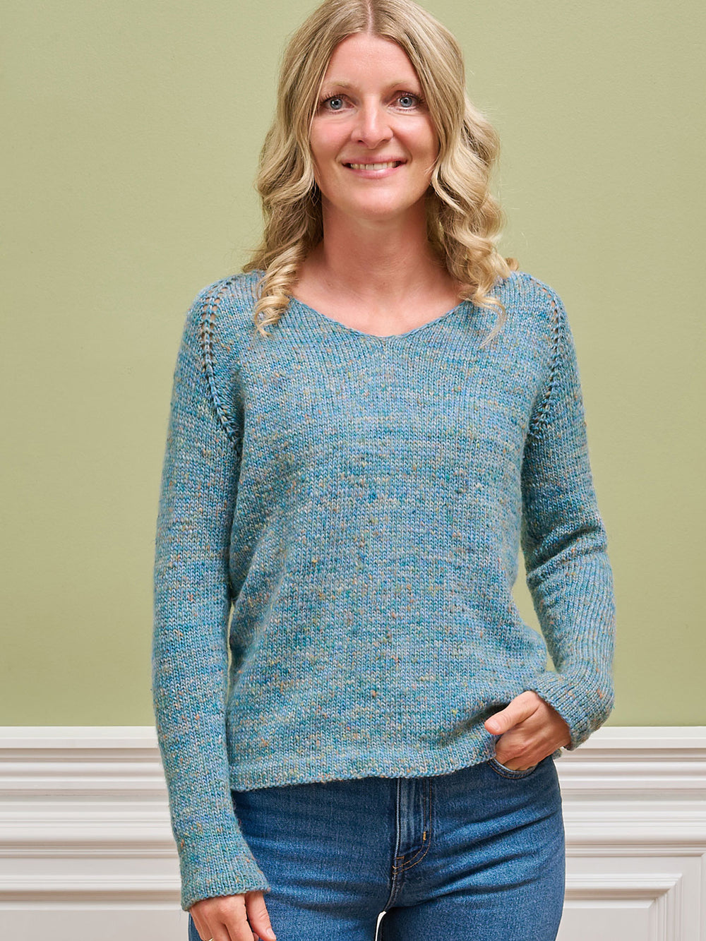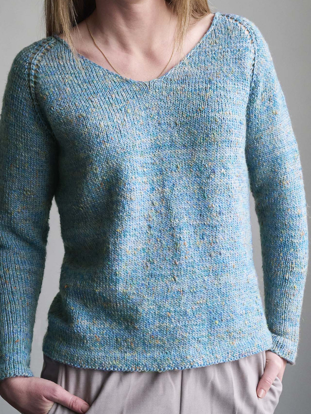 Sweateren er strikket i Premium Georgina, som er et eksklusivt og blødt garn med et meleret udtryk og smukt farvespil. Garnet er 1-trådet og spundet på en kombination af den fineste merinould, lyocell og hør. Sweateren skal håndvaskes med uldvaskemiddel.
