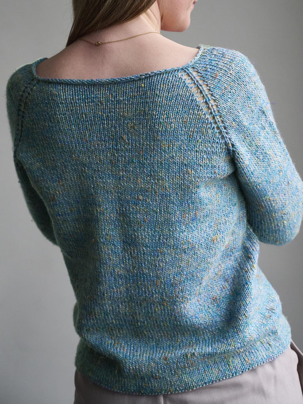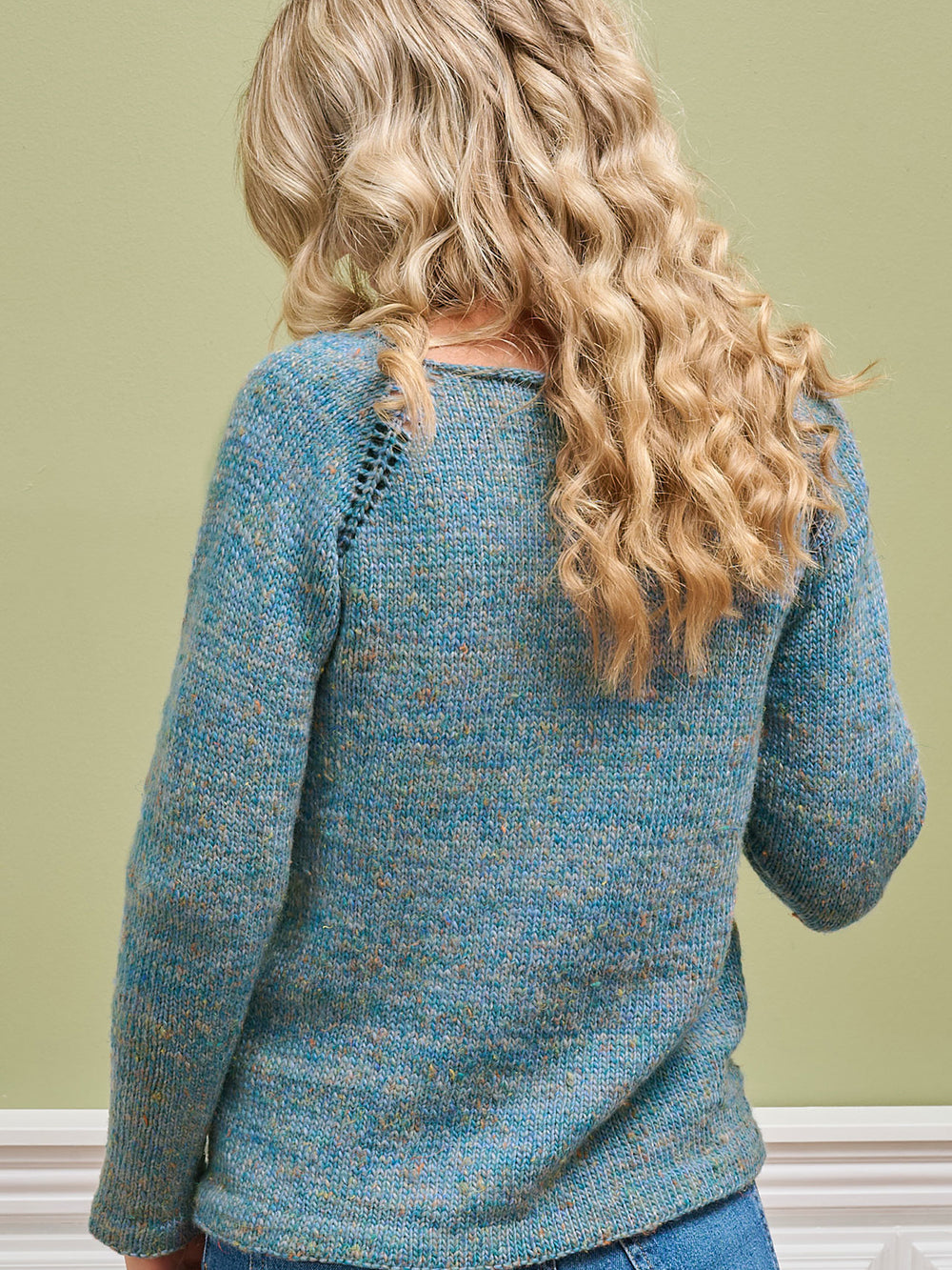 Nina sweater - Georgina Style er en skøn bluse med v-hals og almindelig pasform. Sweateren strikkes oppefra og ned med raglanudtagninger og minimal montering. Den har fine detaljer med et hulmønster langs raglanstriben, og længden på trøjen kan justeres undervejs.