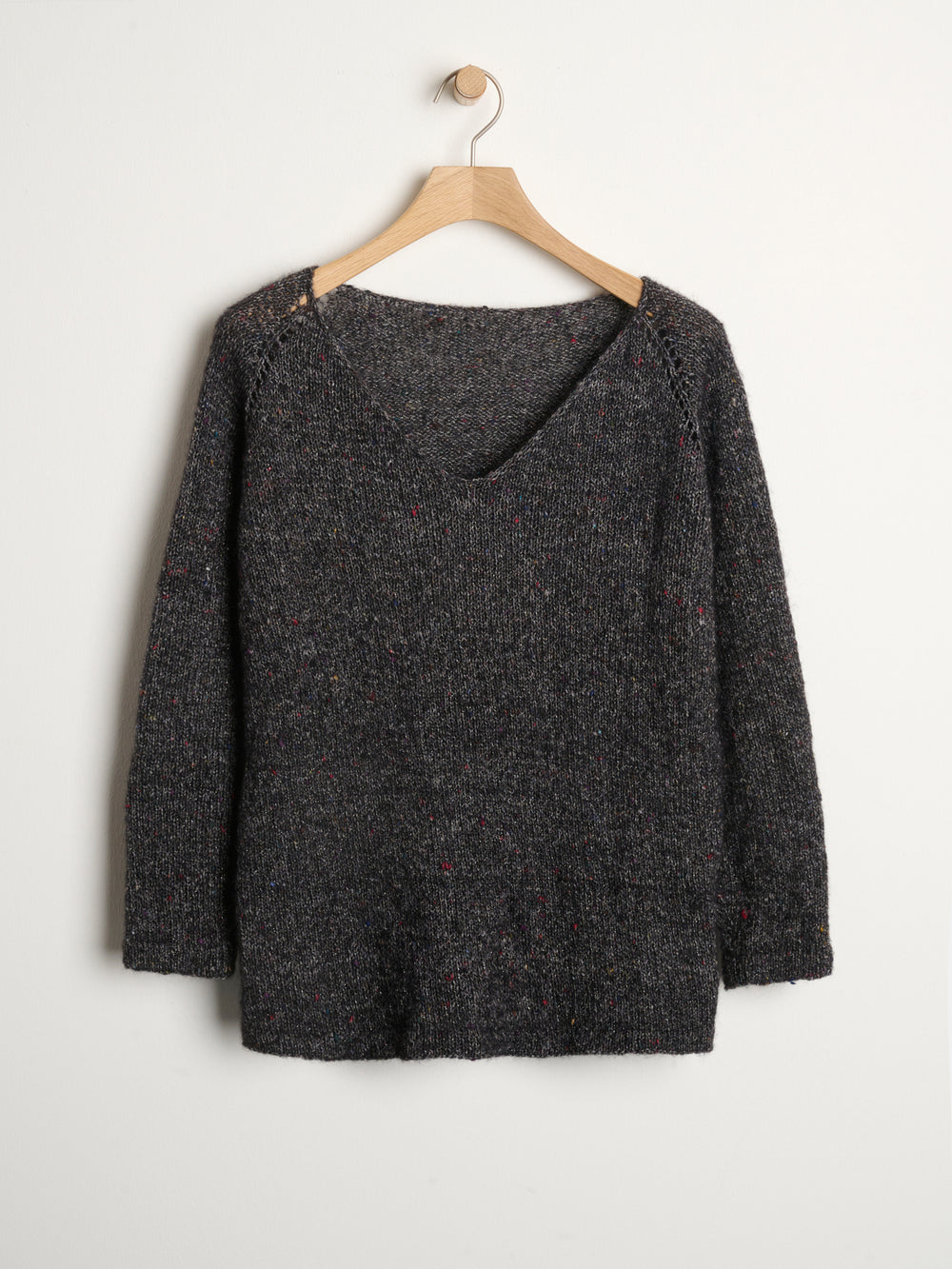 Sweateren har en almindelig løs pasform med et bevægelsesrum på 4 cm. Det gør den en anelse løstsiddende og meget komfortabel, men den er ikke direkte oversize. Samtidig har sweateren også en række fine detaljer som for eksempel skulderudtagningerne, der fremhæves af et smukt hulmønster samt den brede v-hals.