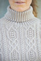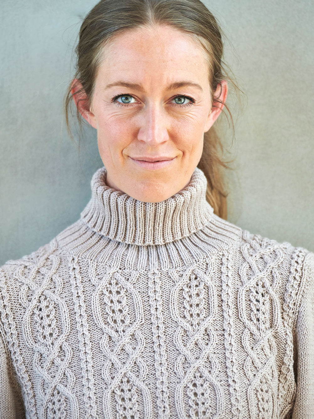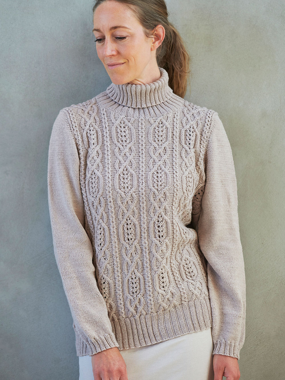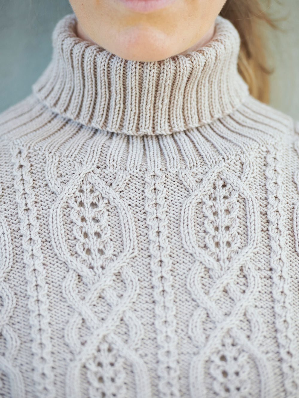 Strikket sweater med rullekrave, som har et virkelig smukt snoningsmønster på forstykket. Bagstykke og ærmer laves i glatstrik, og forstykket gør derfor virkelig sweateren til noget særligt.