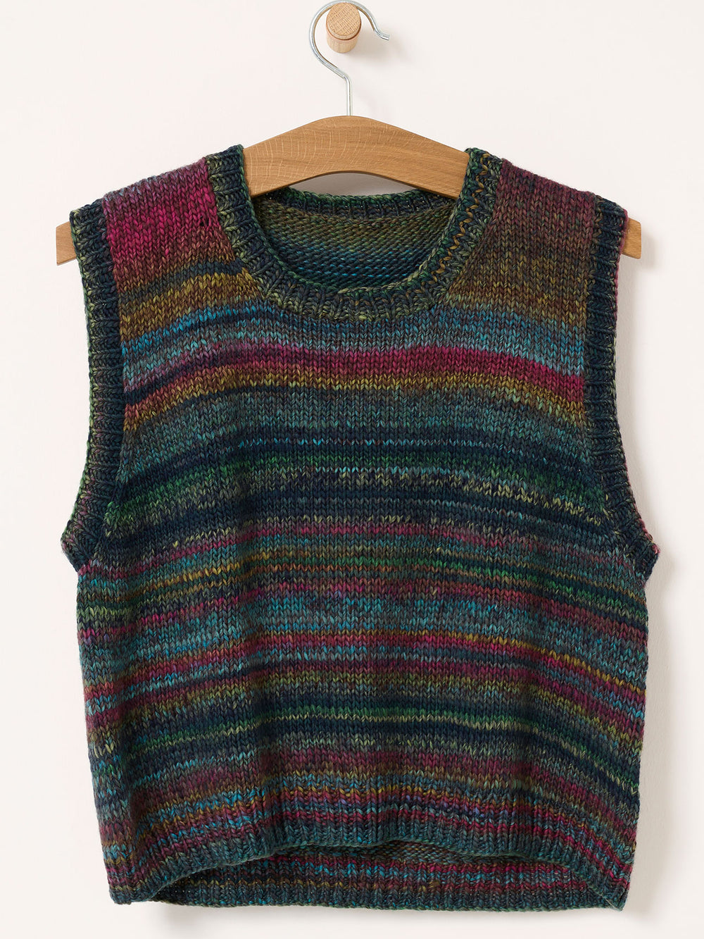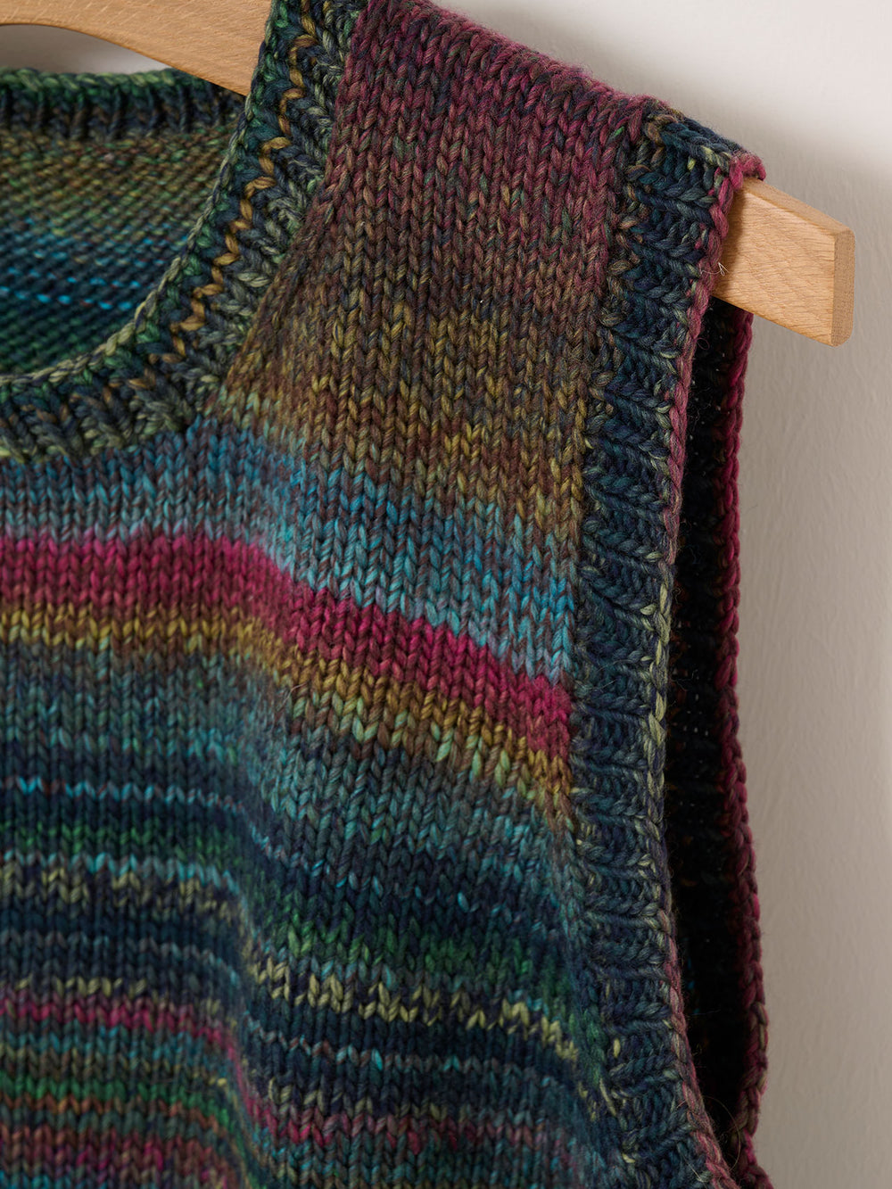Slipoveren strikkes i det bløde og farverige Mayflower Premium Maxima, som er en eksklusiv garnkvalitet i ekstrafin merinould. Farverne skifter i flotte overgange. Vesten får en lækker fylde, da Maxima er et lidt tykt garn med en dejlig struktur og god lune.