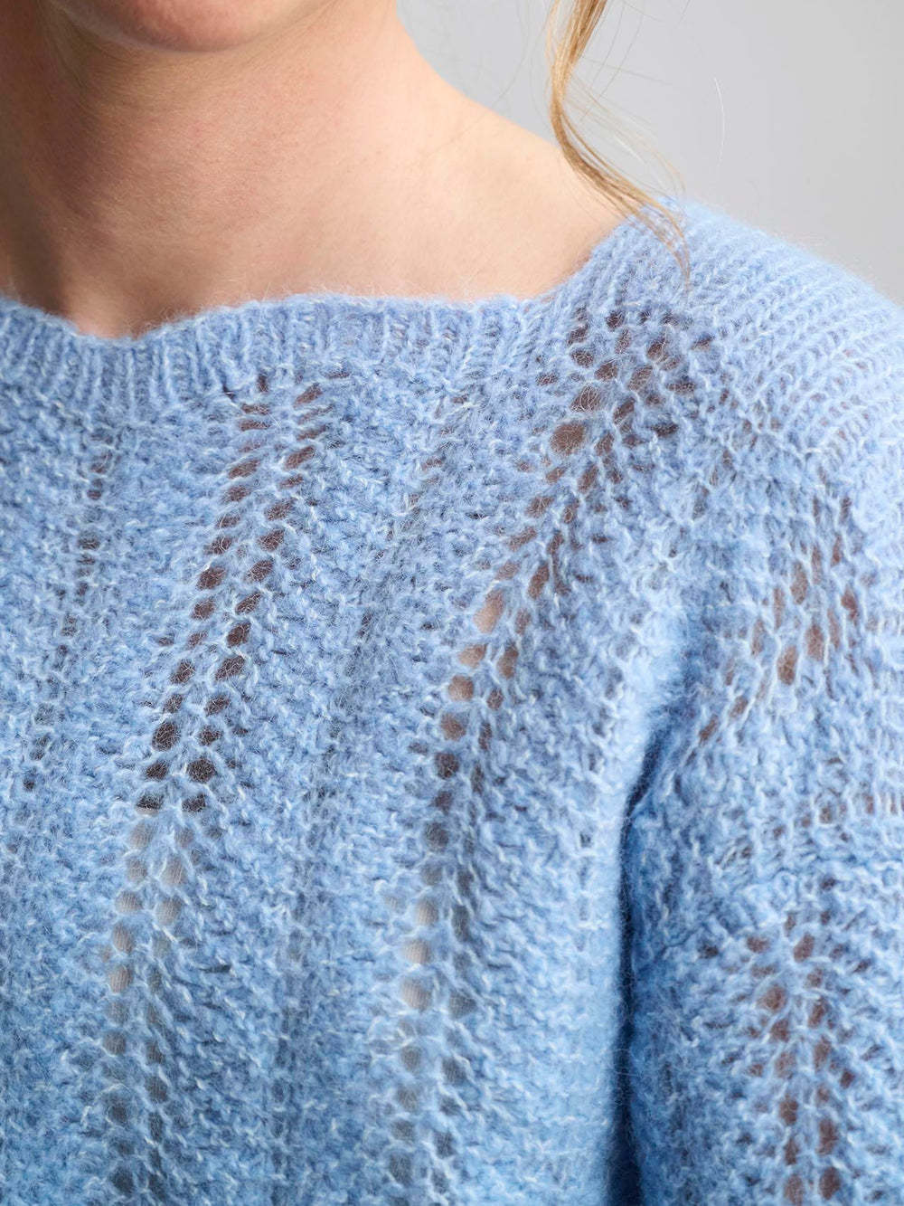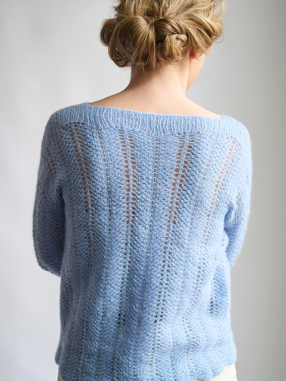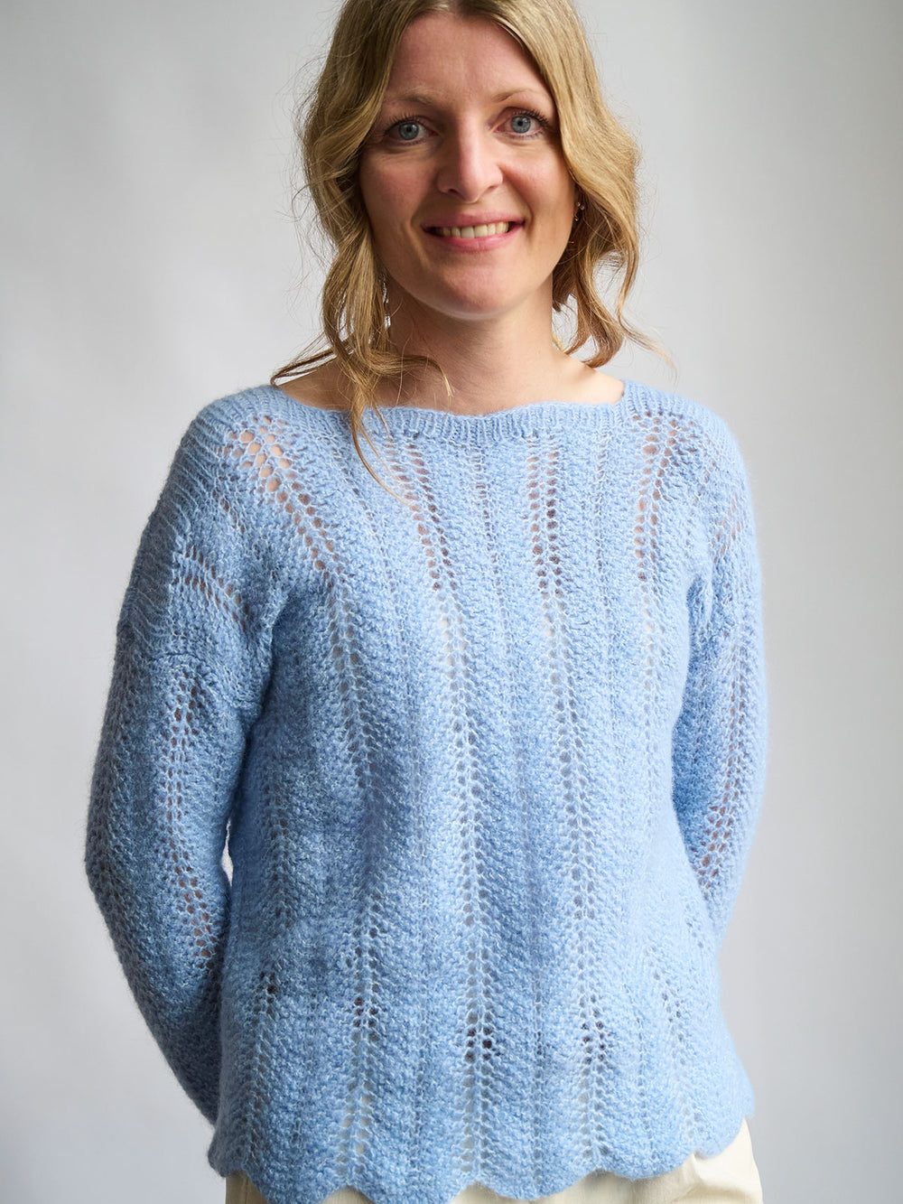 Luftig bluse med det smukkeste, bølgede hulmønster. Nynne blusen strikkes i det eksklusive Mayflower Premium Valentina.