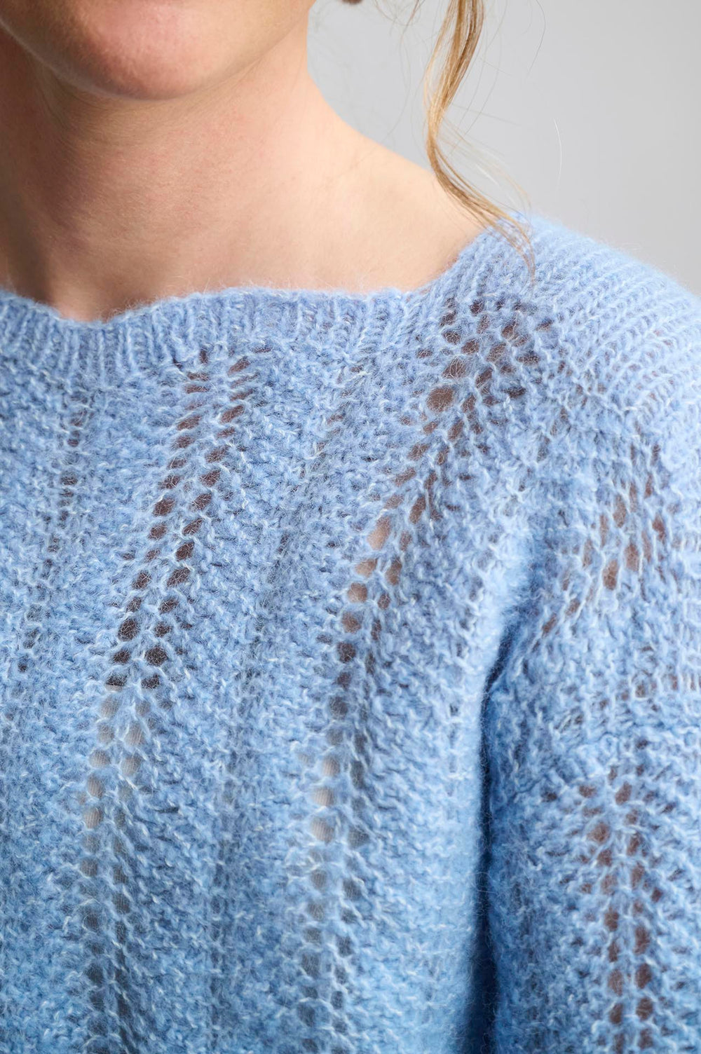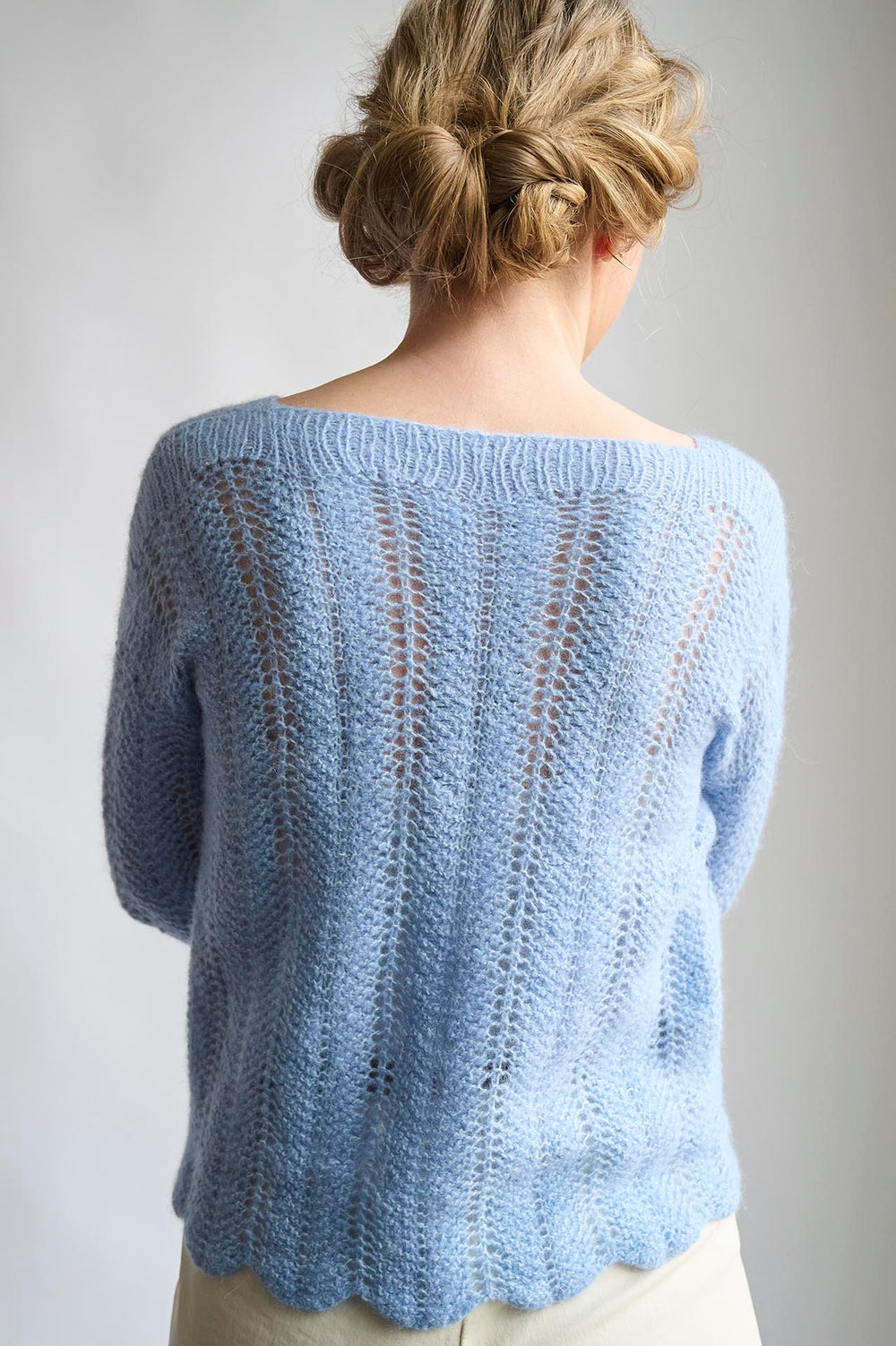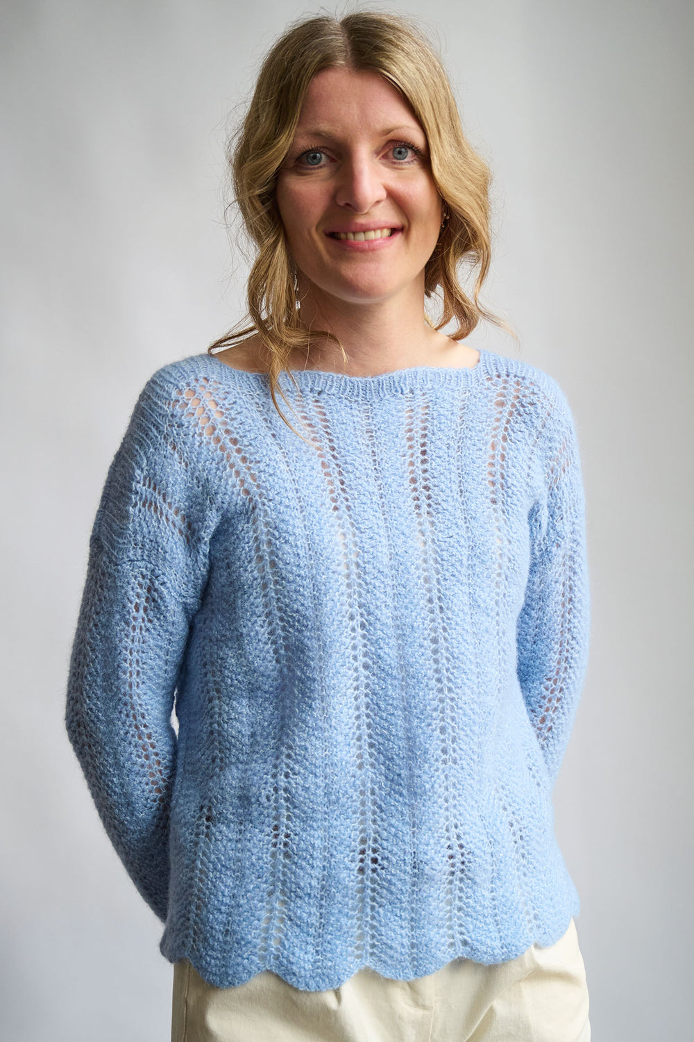 Luftig bluse med det smukkeste, bølgede hulmønster. Nynne blusen strikkes i det eksklusive Mayflower Premium Valentina.