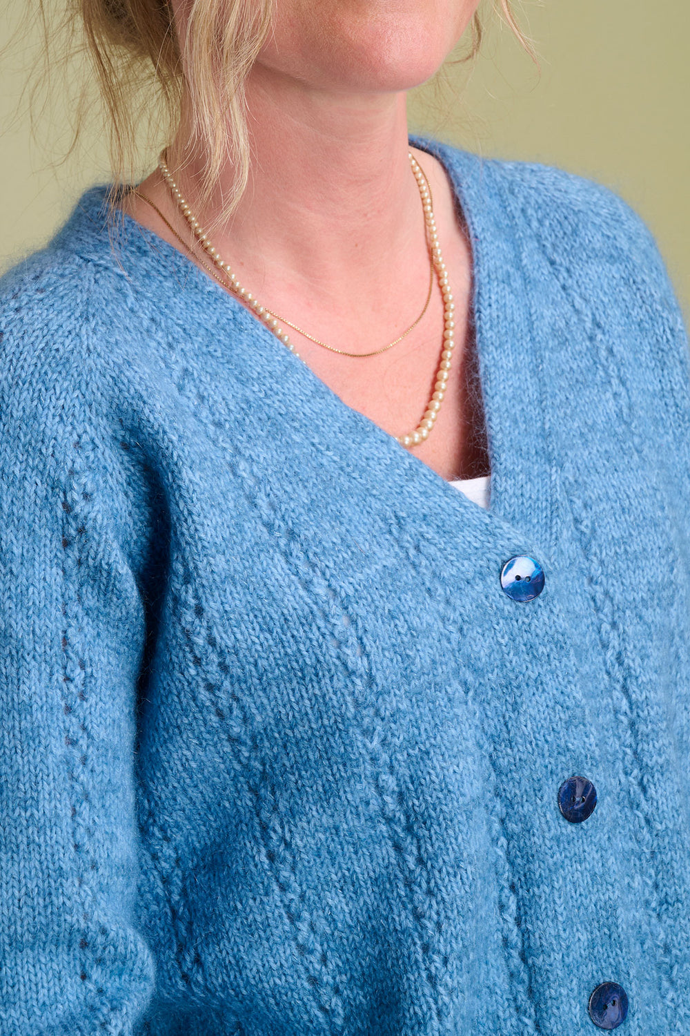 Denne version af Odder cardigan er strikket i én tråd Mayflower York + én tråd Mayflower Super Kid Silk. York er et virkelig blødt og fint garn i 100% uld, og kombinationen med Super Kid Silk gør cardiganen utrolig let og lækker.