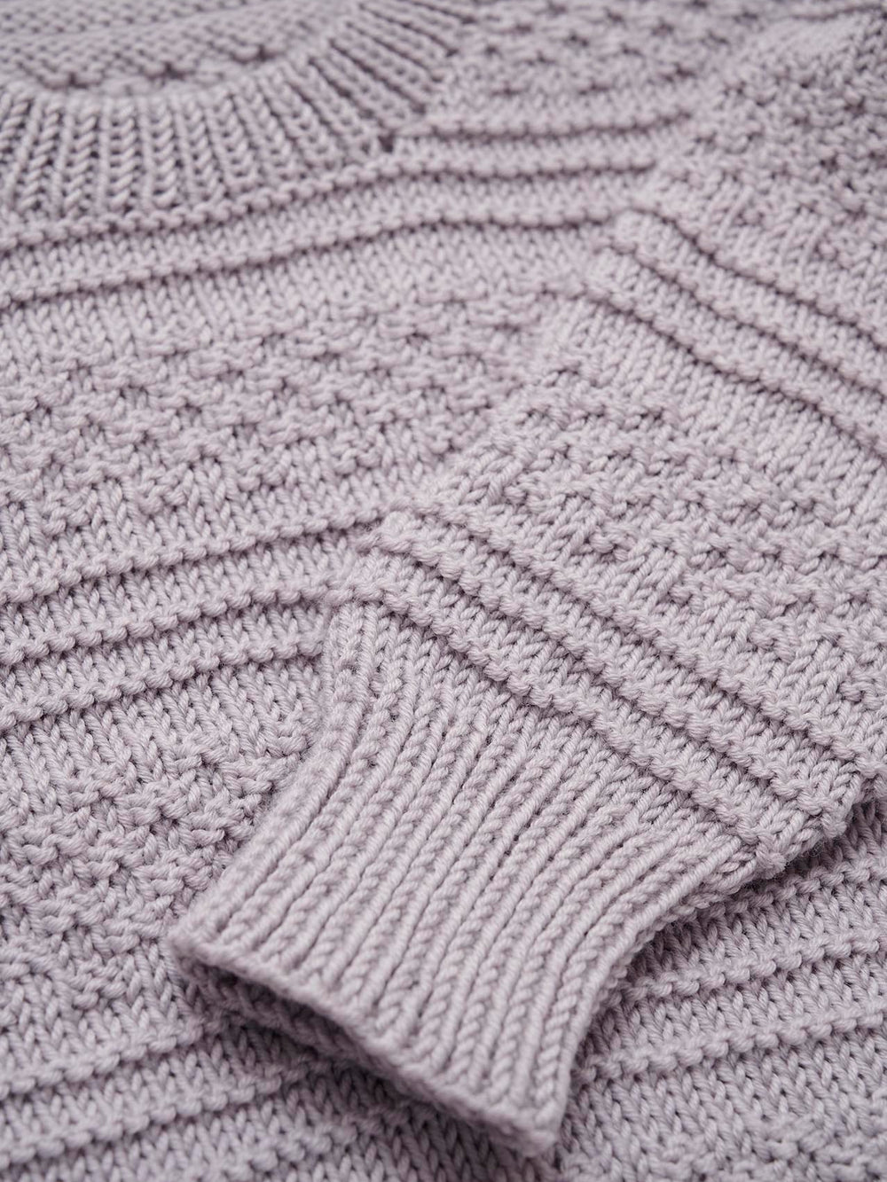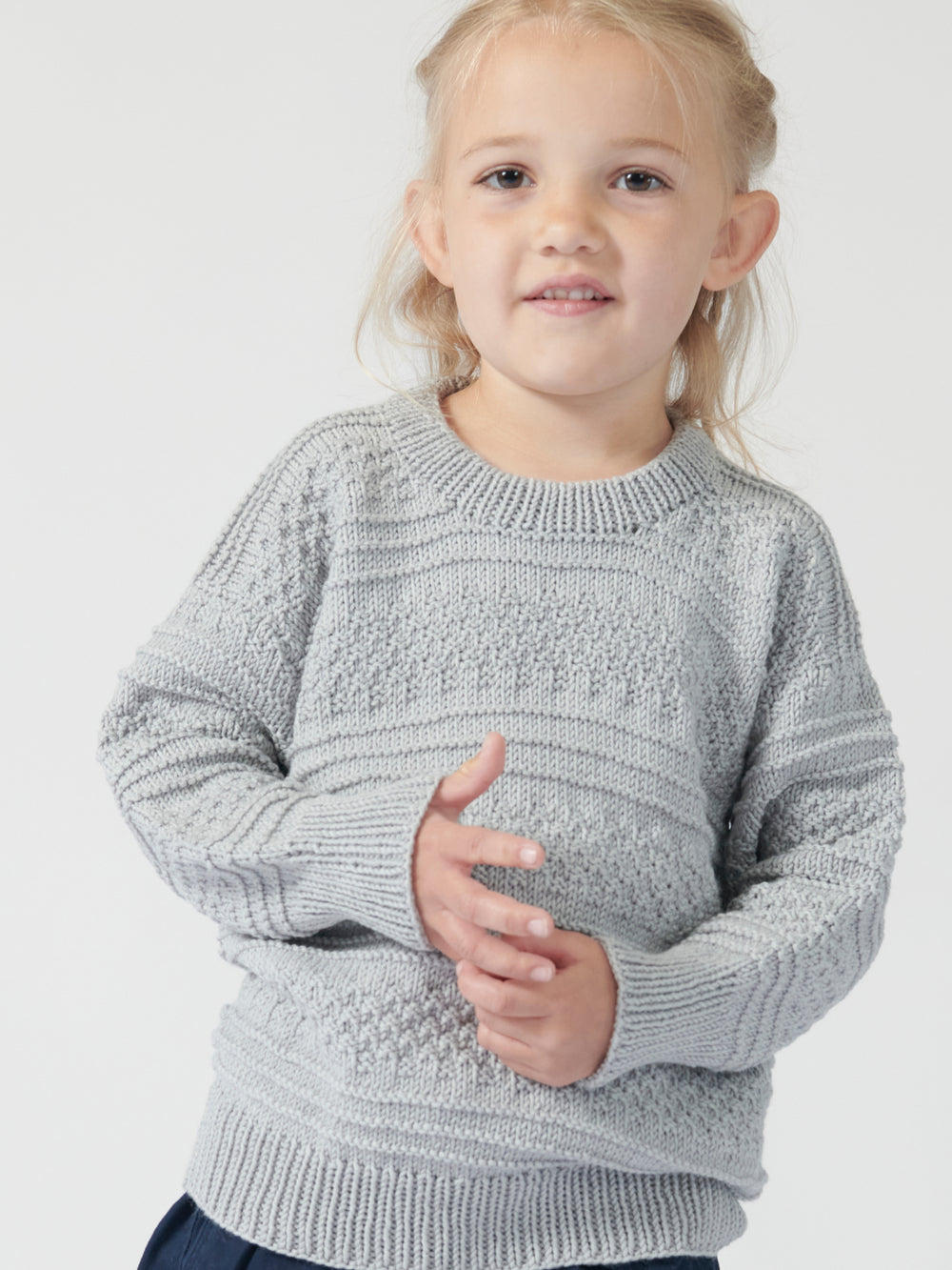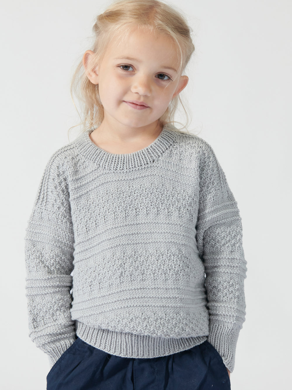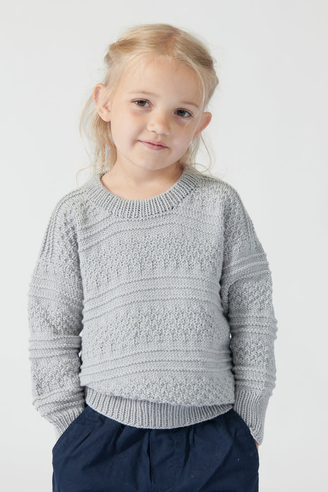 Oskar trøjen har et gennemgående strukturmønster på både krop og ærmer, og trøjen strikkes topdown. Strukturmønsteret består af ret- og vrangmasker.