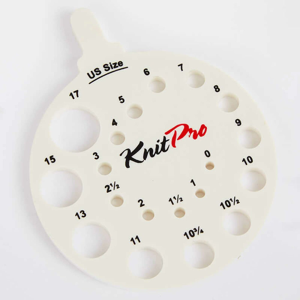 Rund strikkepindemåler i plastik fra KnitPro, som nemt og hurtigt hjælper dig med at se, hvilken størrelse din strikkepind er. Strikkepindemåleren kan måle strikkepinde fra str. 2.0 mm og op til 12.0 mm (US 0-17).