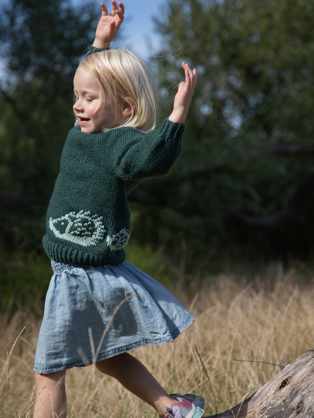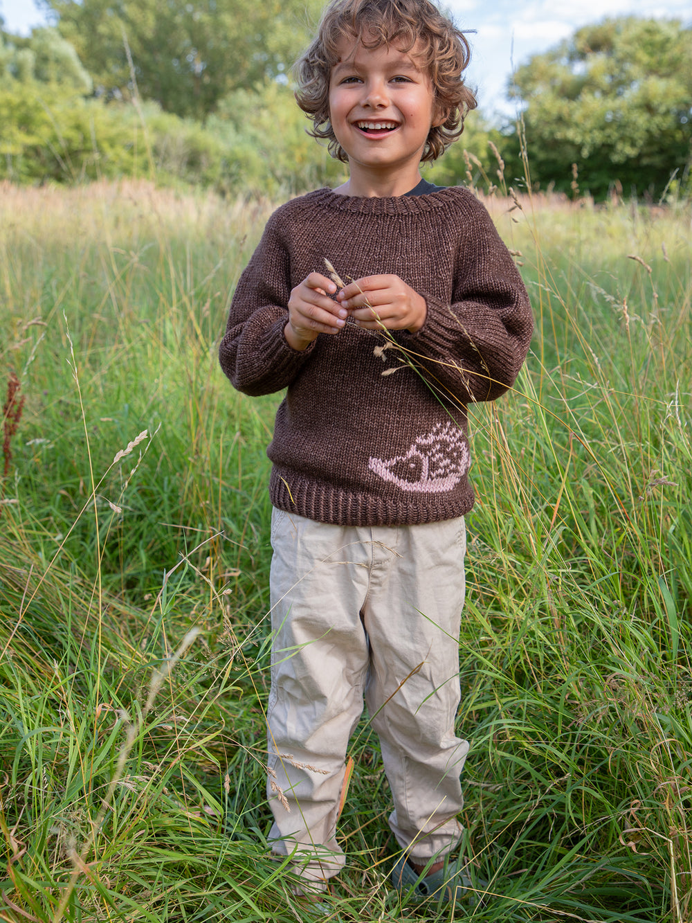 Pindsvine-sweateren er en meget begyndervenlig opskrift, som er lavet i samarbejde med WWF Verdensnaturfonden. Sweateren strikkes oppefra og ned uden montering, og pindsvinene broderes på til sidst. Da sweateren strikkes top-down, er det også nemt at tilpasse længden på både krop og ærmer.