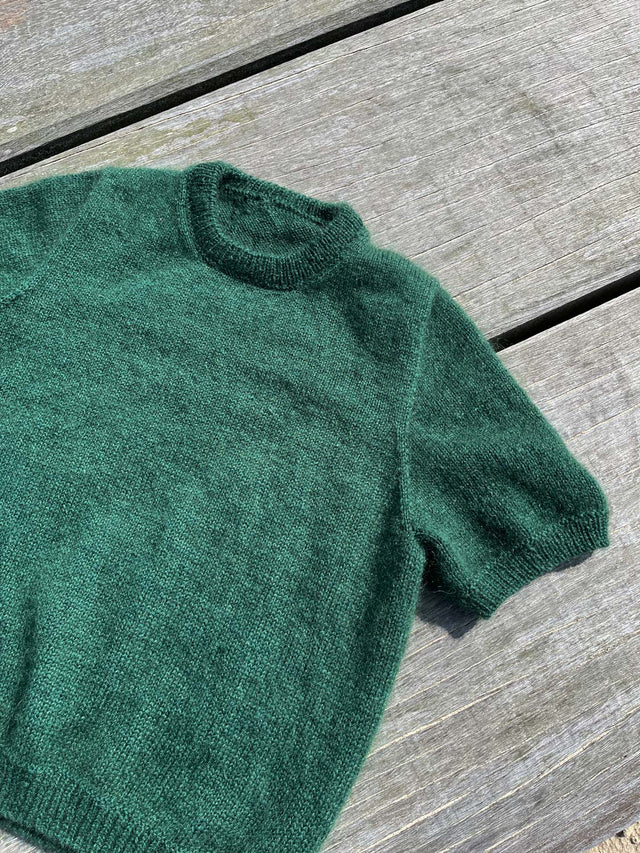 T-shirten er strikket med 2 tråde: 1 tråd Mayflower 1 Class Cashmere + 1 tråd Mayflower Super Kid Silk. Kombinationen af det fluffy og lette Super Kid Silk sammen med det uldne 1 Class Cashmere giver en virkelig blød og lækker t-shirt, som vil føles skøn at have på hele året rundt.