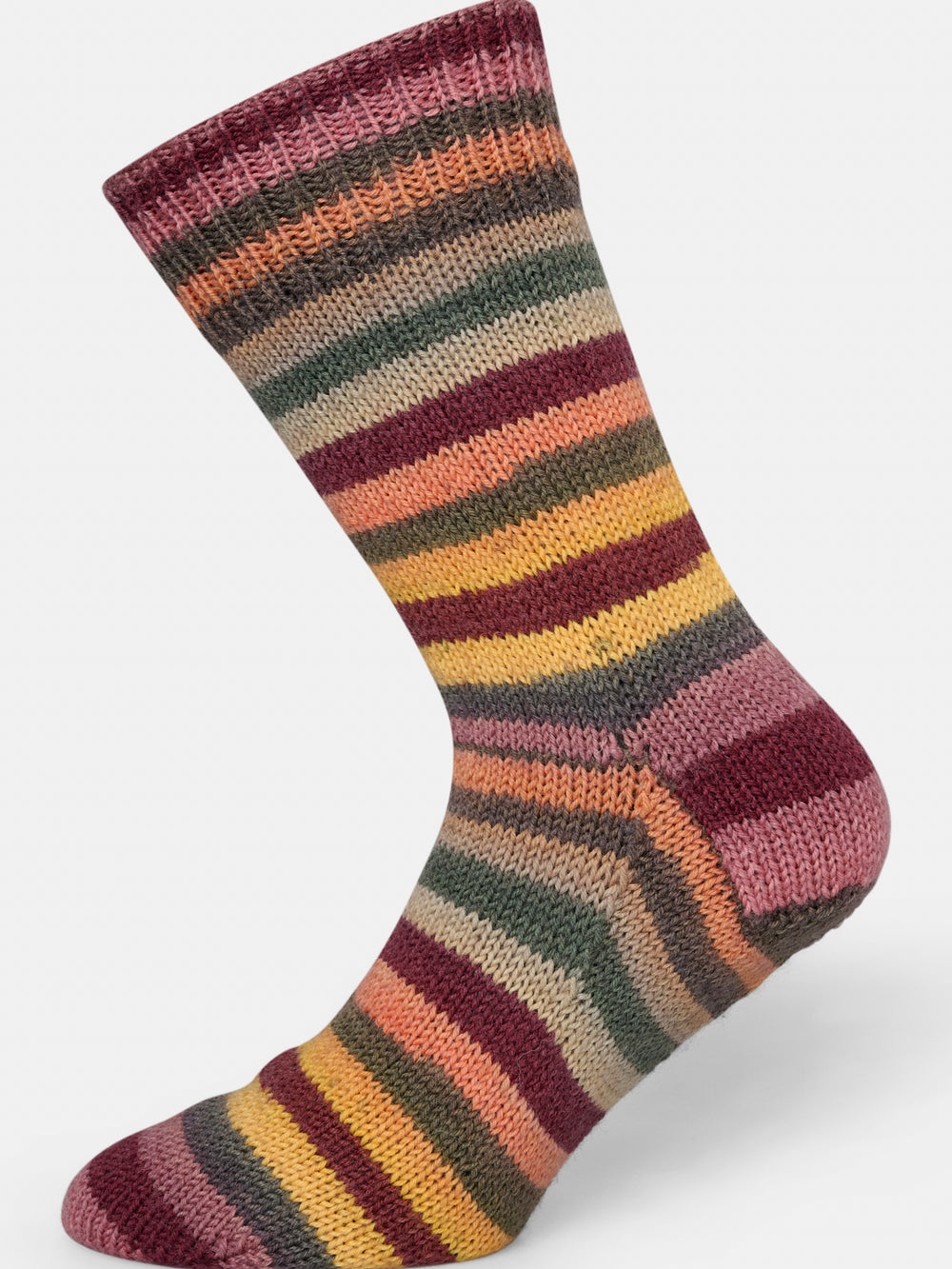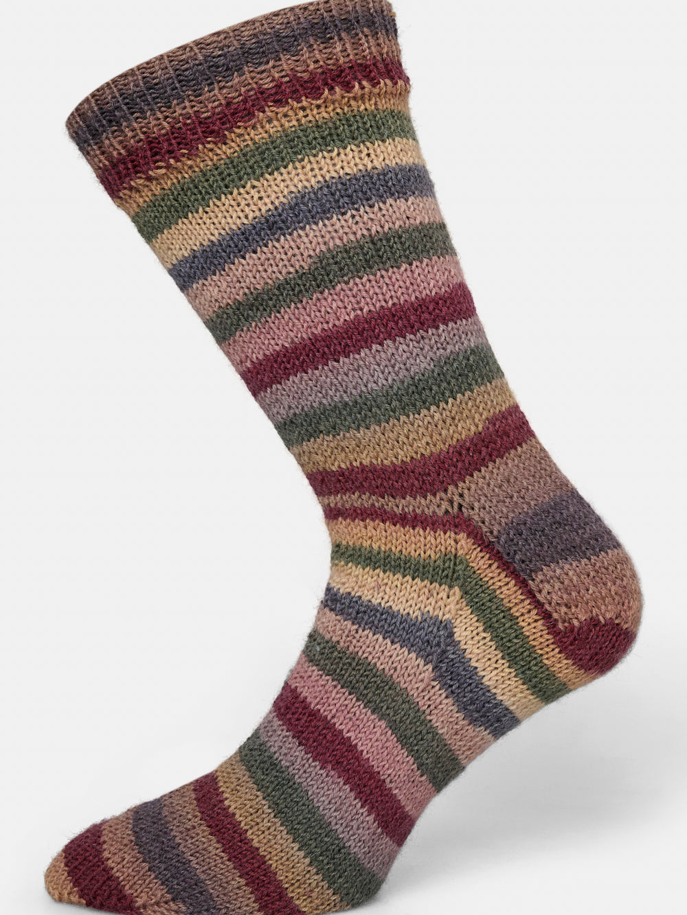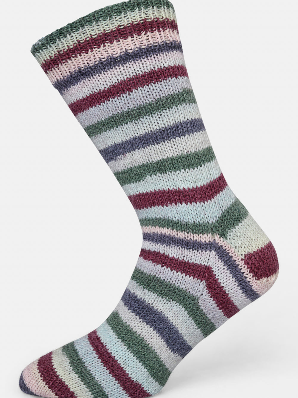 Strømperne er strikket i det skønne strømpegarn, Mayflower Premium Sock Wool Ocean, som er spundet med 75% varm uld og 25% slidstærk polyamid. Den lækre uld sørger for varme fødder, mens polyamiden giver høj slidstyrke og strømper til flere års brug. Med andre ord er Premium Sock Wool et strømpegarn af meget høj kvalitet. Ocean-serien giver strømperne et stribet mønster.
