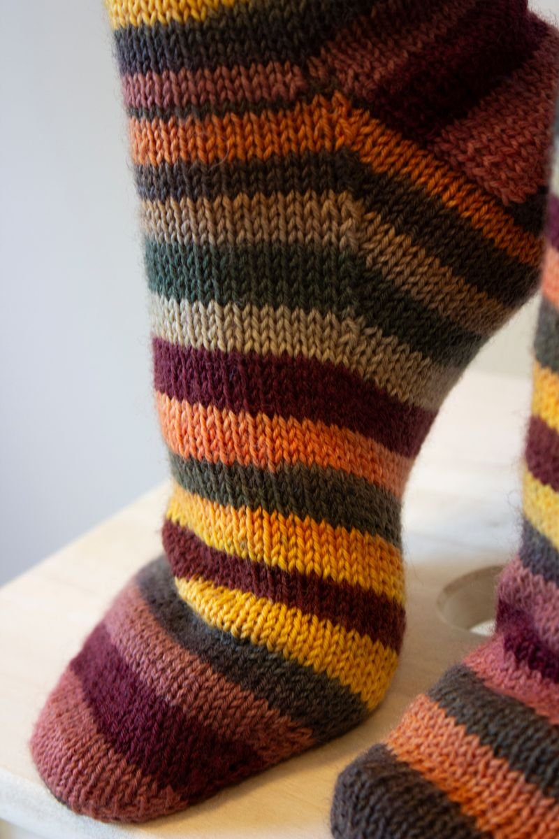 Helt klassiske og enkle men ikke desto mindre skønne strømper, som har kilehæl. Strømperne strikkes i glatstrik med en ribkant foroven. Med glatstrik kan du hurtigt strikke skaft og sål, og opskriften hjælper dig godt igennem både hæl og tå. Slutresultatet er et par skønne og behagelige strømper, som har et flot, stribet mønster.
