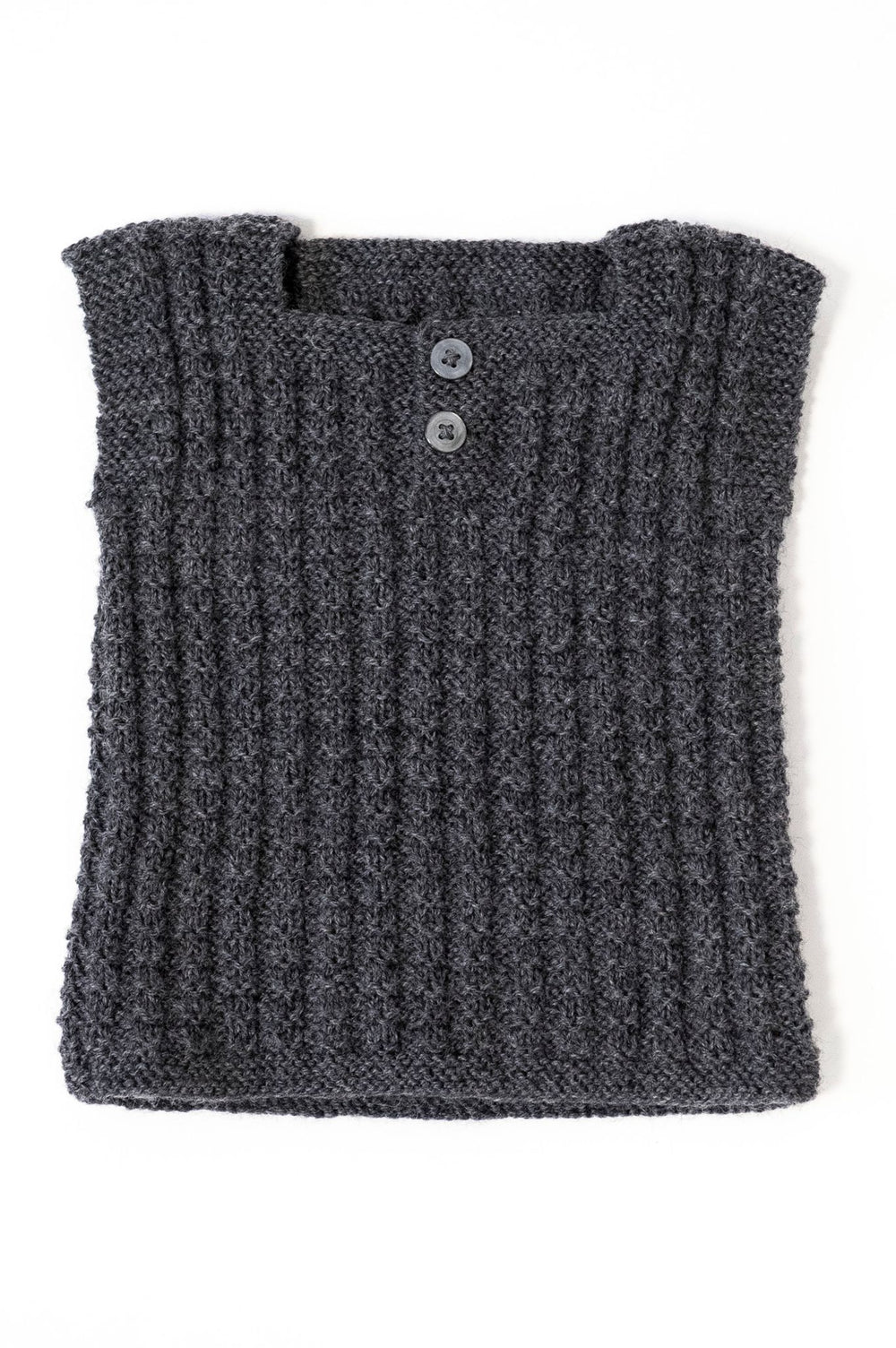På det viste billede er vesten strikket i en mørkegrå farvenuance, hvilket får vesten til at virke ekstra elegant. Den kan bruges som et ekstra lag over de fleste farver.